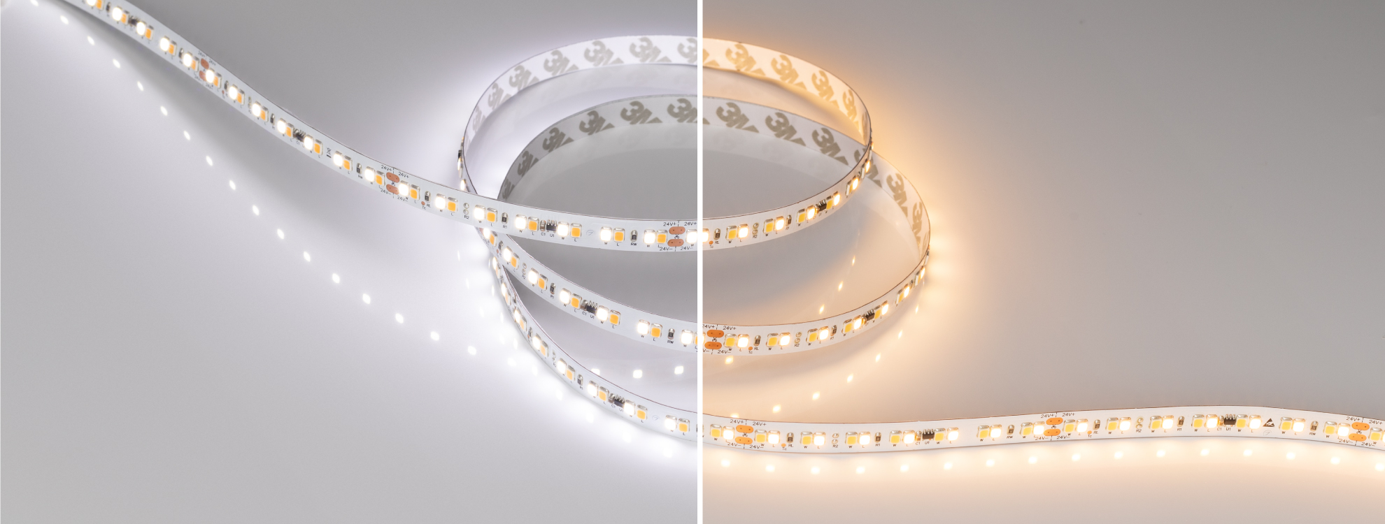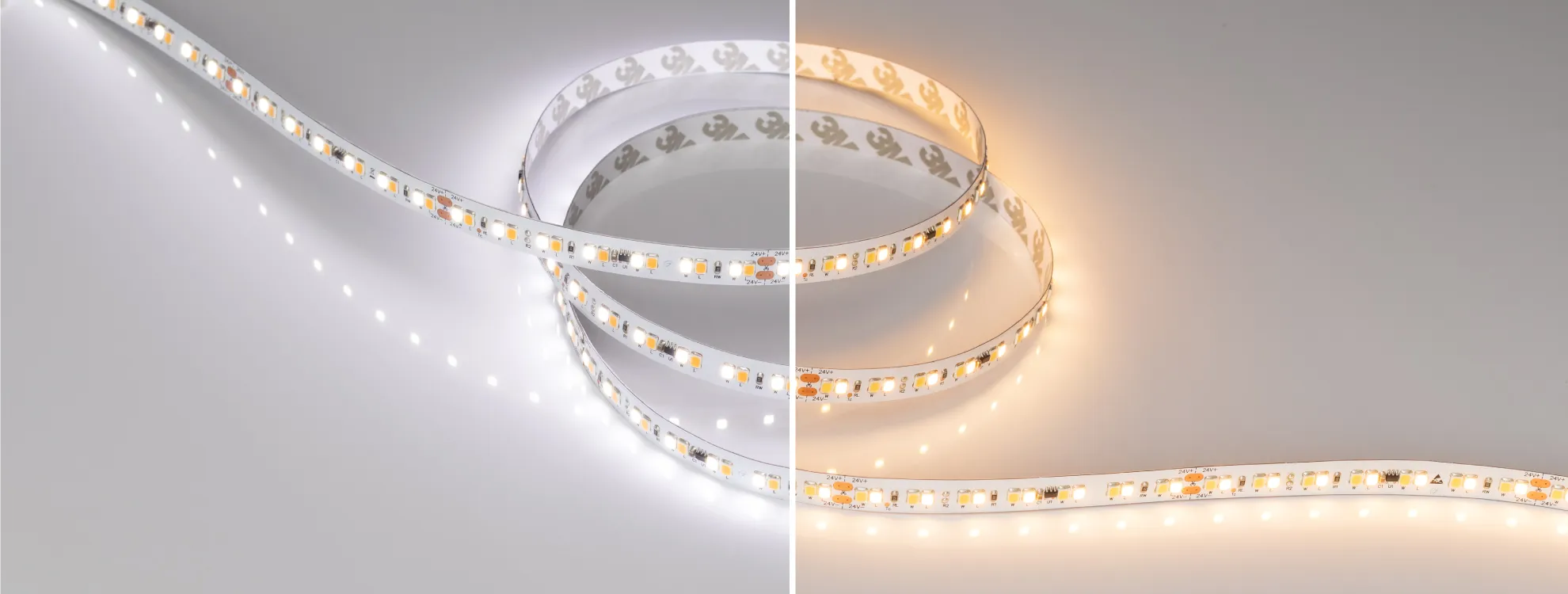 Изменяемая цветовая температура Одна лента сочетает в себе три цвета свечения: теплый белый (2700 К), дневной белый (4000 К) и холодный белый (6000 К).