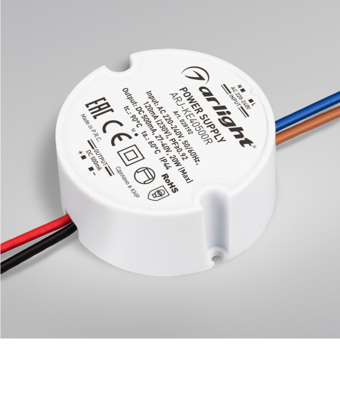 Источники питания ARJ-ROUND в круглом пластиковом корпусе предназначены для питания светодиодов, светодиодных светильников и других устройств, имеющих питание фиксированным током.