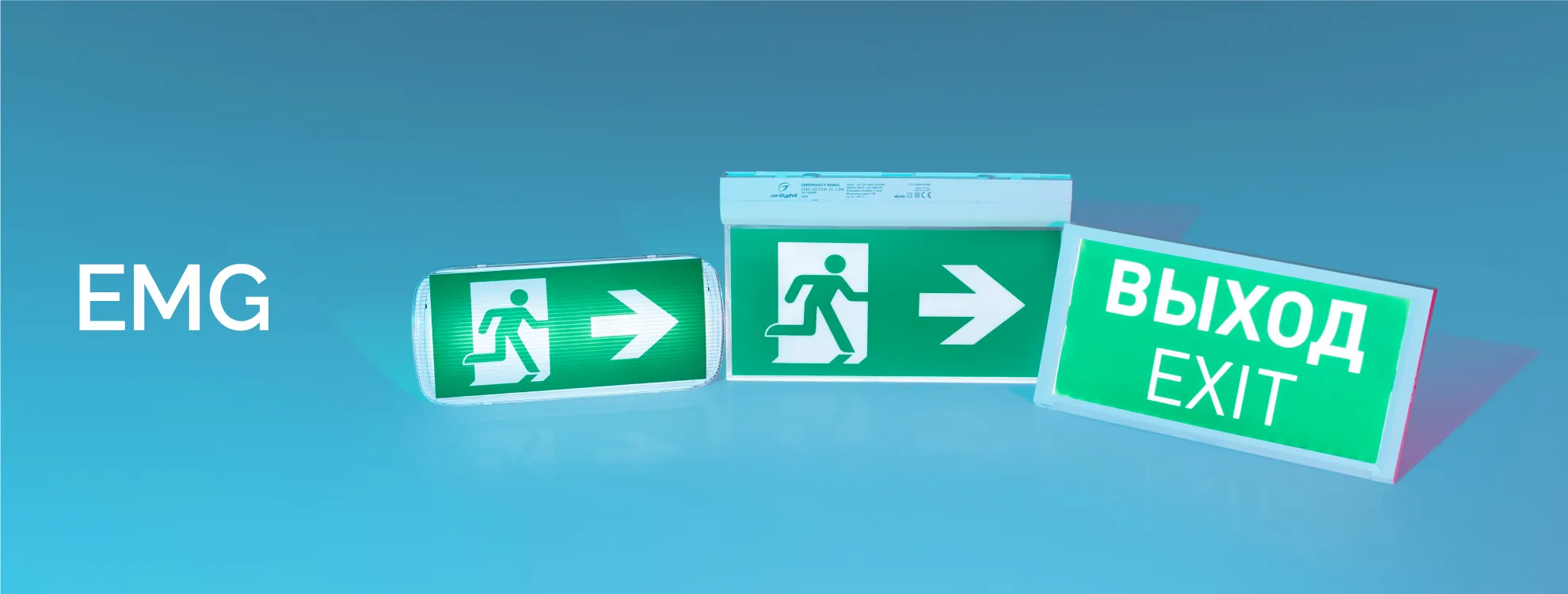 Аварийные указатели серии EMG предназначены для навигации в коммерческих и муниципальных зданиях, в том числе и в условиях отключения электроэнергии. Для всех моделей предусмотрены различные варианты пиктограмм, указывающих на путь к выходу: стрелки вверх/вниз/вправо/влево, а также надпись «Выход/Exit».