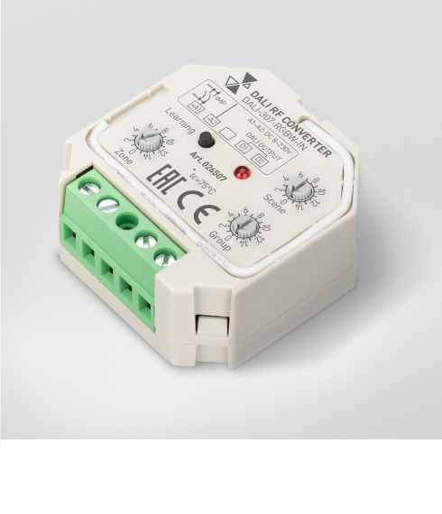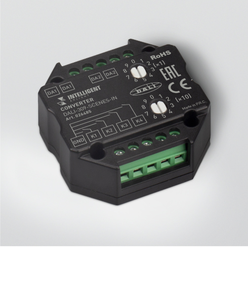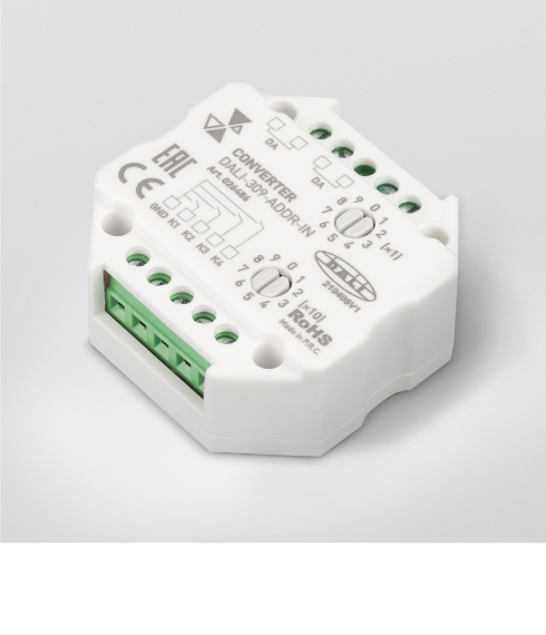 Разные протоколы В серии доступны устройства, преобразующие команды DALI в сигнал 0/1–10 В или DMX512, а также устройствами с сухими контактами на входе для подключения выключателей или датчиков.