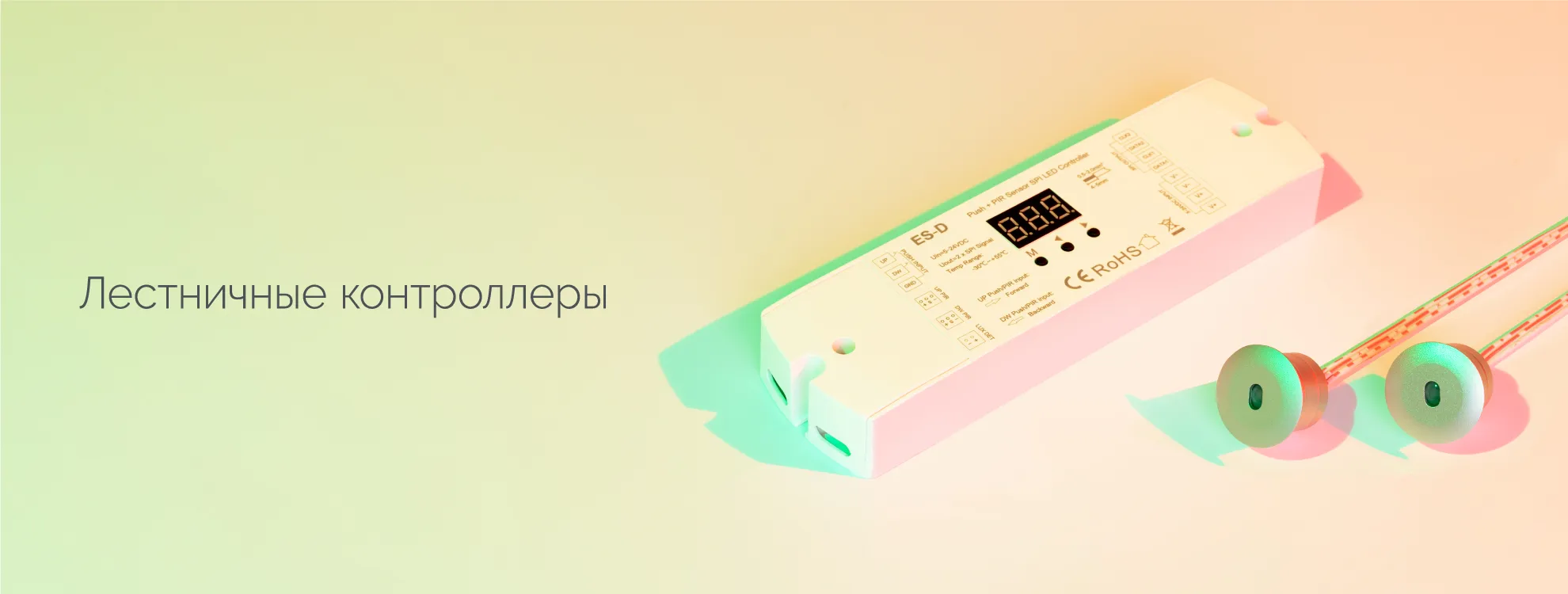 Контроллеры для создания динамической подсветки лестниц. За счет пошагового включения светодиодных лент, установленных в ступени или перила, можно настроить различные динамические эффекты и таким образом превратить лестницу в произведение искусства.
