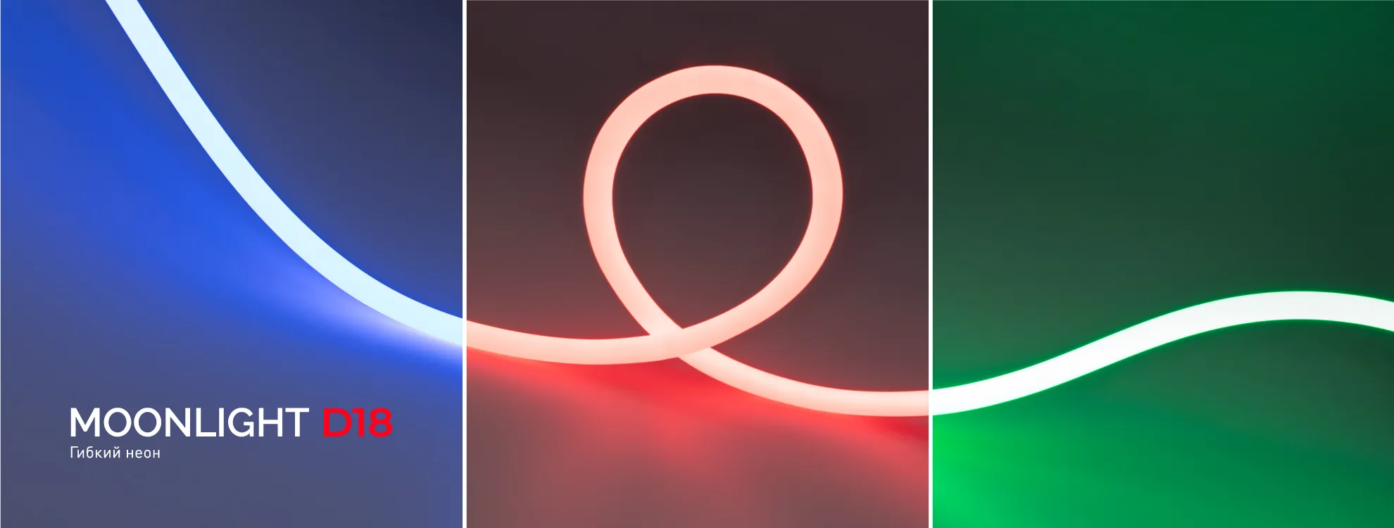 Гибкий неон MOONLIGHT с диаметром 18 мм обладает равномерным свечением, направленным на 360°. С помощью MOONLIGHT D18 возможно создать локальное и декоративное освещение, а также оригинальные арт-объекты. 3D-инсталляции на основе круглого гибкого неона гармонично впишутся в гостиные, кухни, детские, а также в коммерческие пространства.