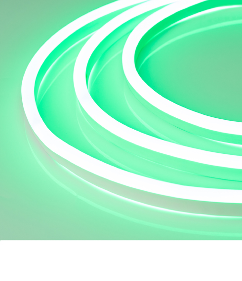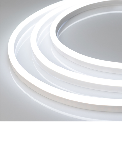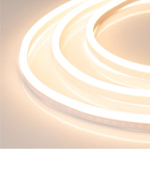 Гибкий неон NEON — отличное решение для декоративной подсветки ступеней, рекламных конструкций, а также для оформления кафе, баров, ванных и детских комнат. За счет прямоугольного сечения 16×8 мм гибкий неон легко встраивается в профиль и небольшие углубления в мебели. В серии представлены модели с безопасным напряжением 24 В.