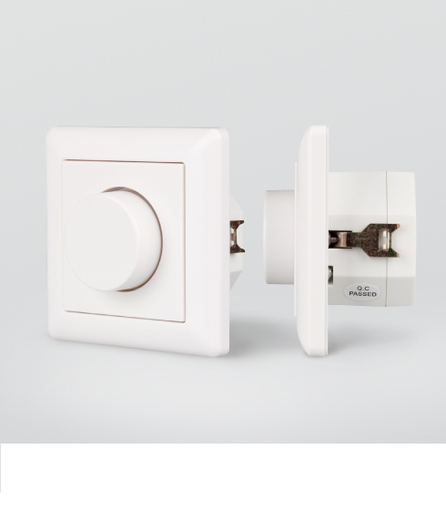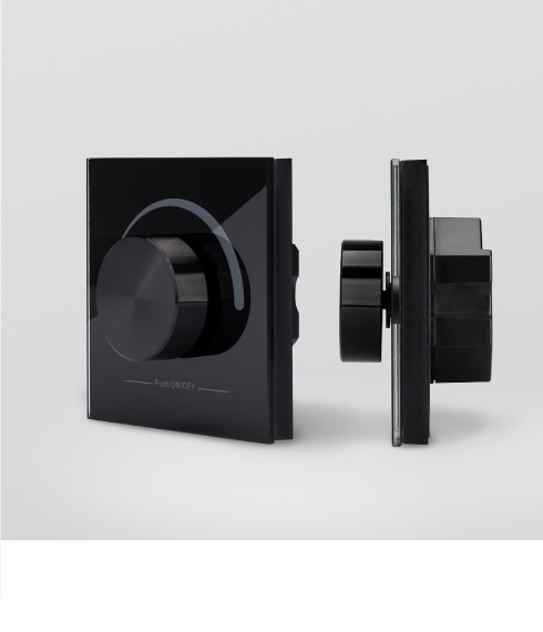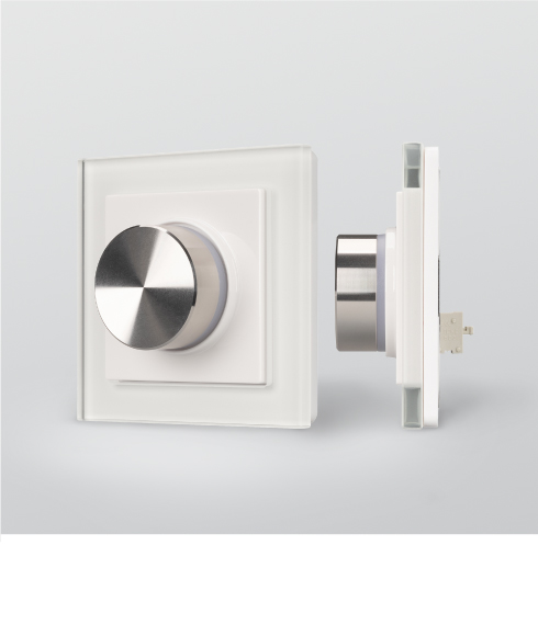 Встраиваемые панели с вращающимся регулятором, работающие по стандарту DALI, предназначены для управления светодиодными лентами, светильниками и другими источниками света, использующими стандартный цифровой интерфейс DALI. Устройства позволяют включать, выключать свет и регулировать яркость или оттенок света.