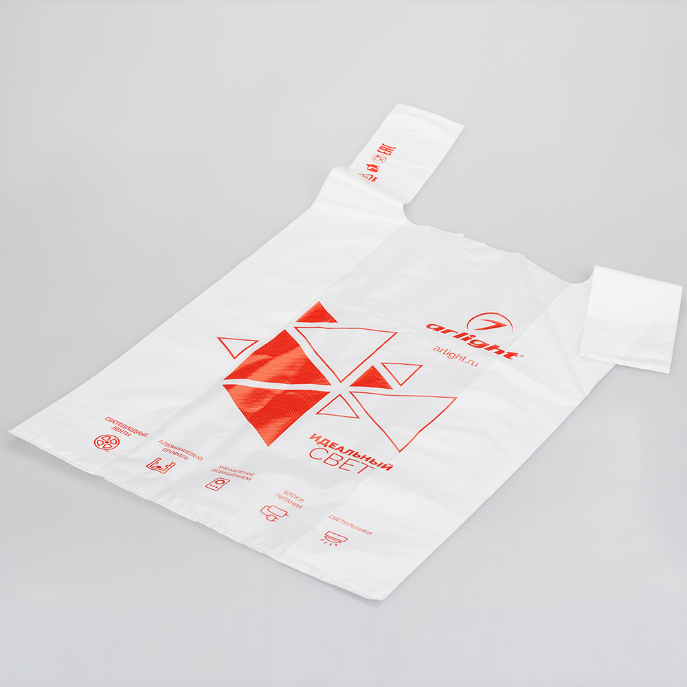 Пакет-майка полиэтиленовый Arlight. Размер 32х55х7 см, ПНД, плотность 25 мкм, максимально допустимый вес 16 кг.