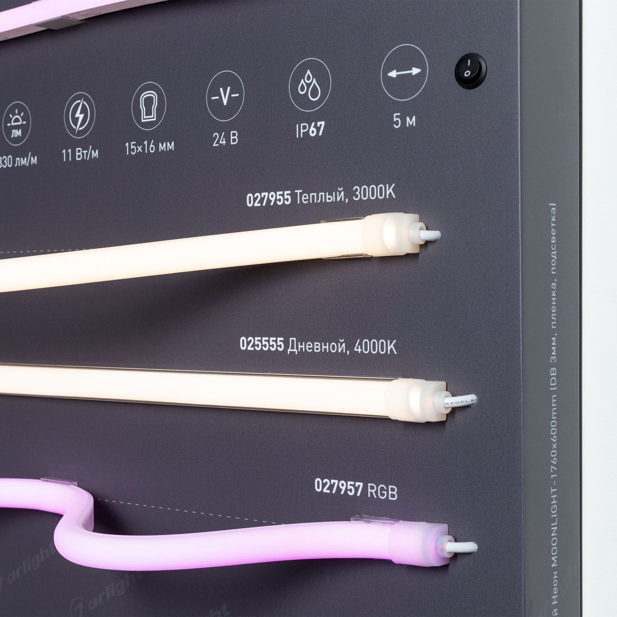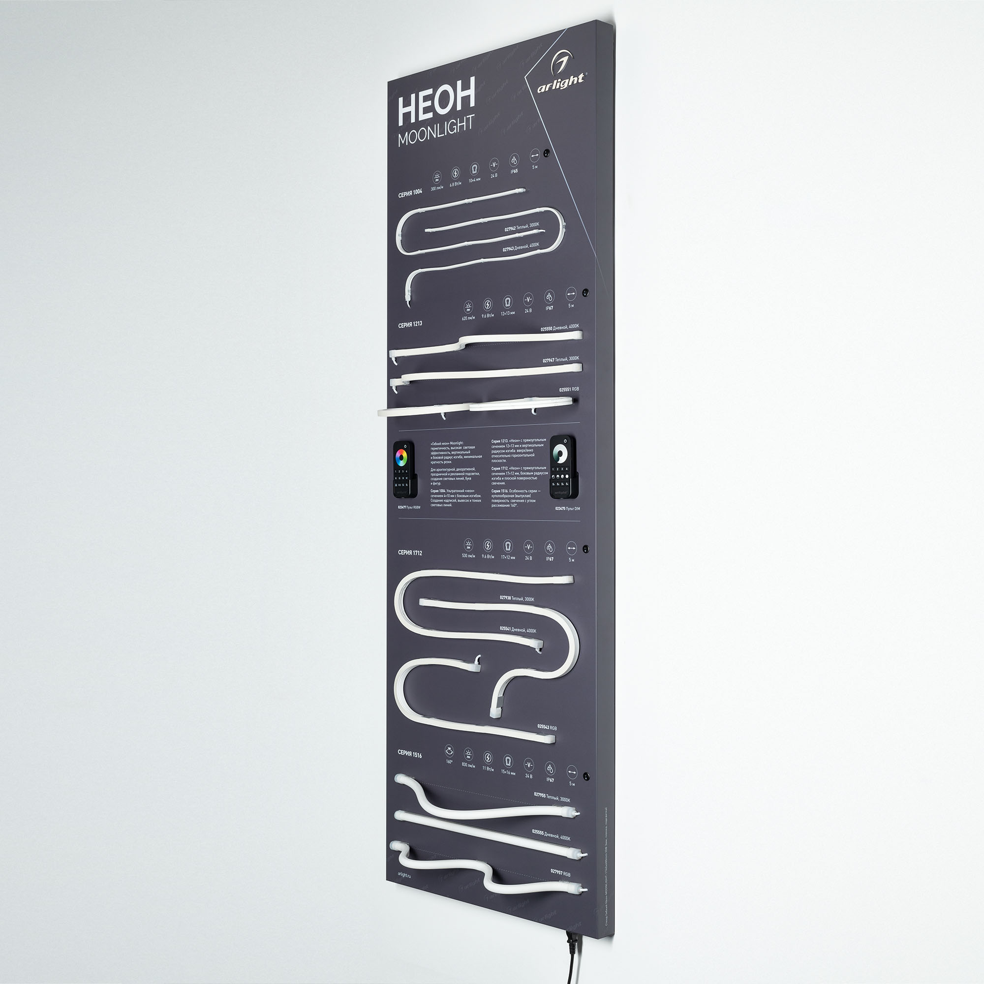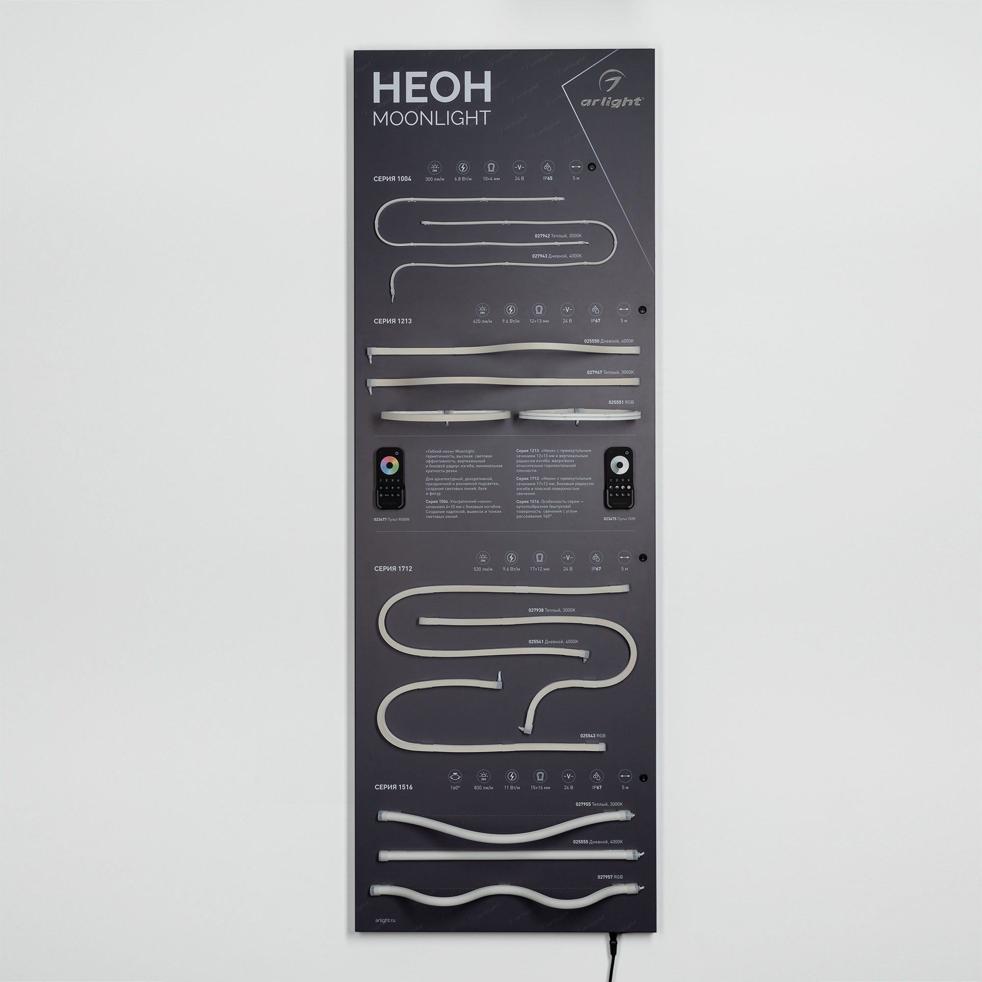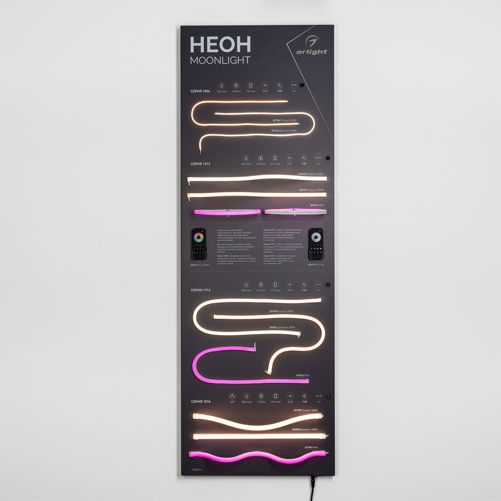 На стенде представлен светодиодный гибкий неон серии MOONLIGHT. Модели различных типоразмеров и цветов, боковой и вертикальный изгиб, прямоугольное и куполообразное сечение, а также модели RGB с возможностью ручной регулировки цвета.