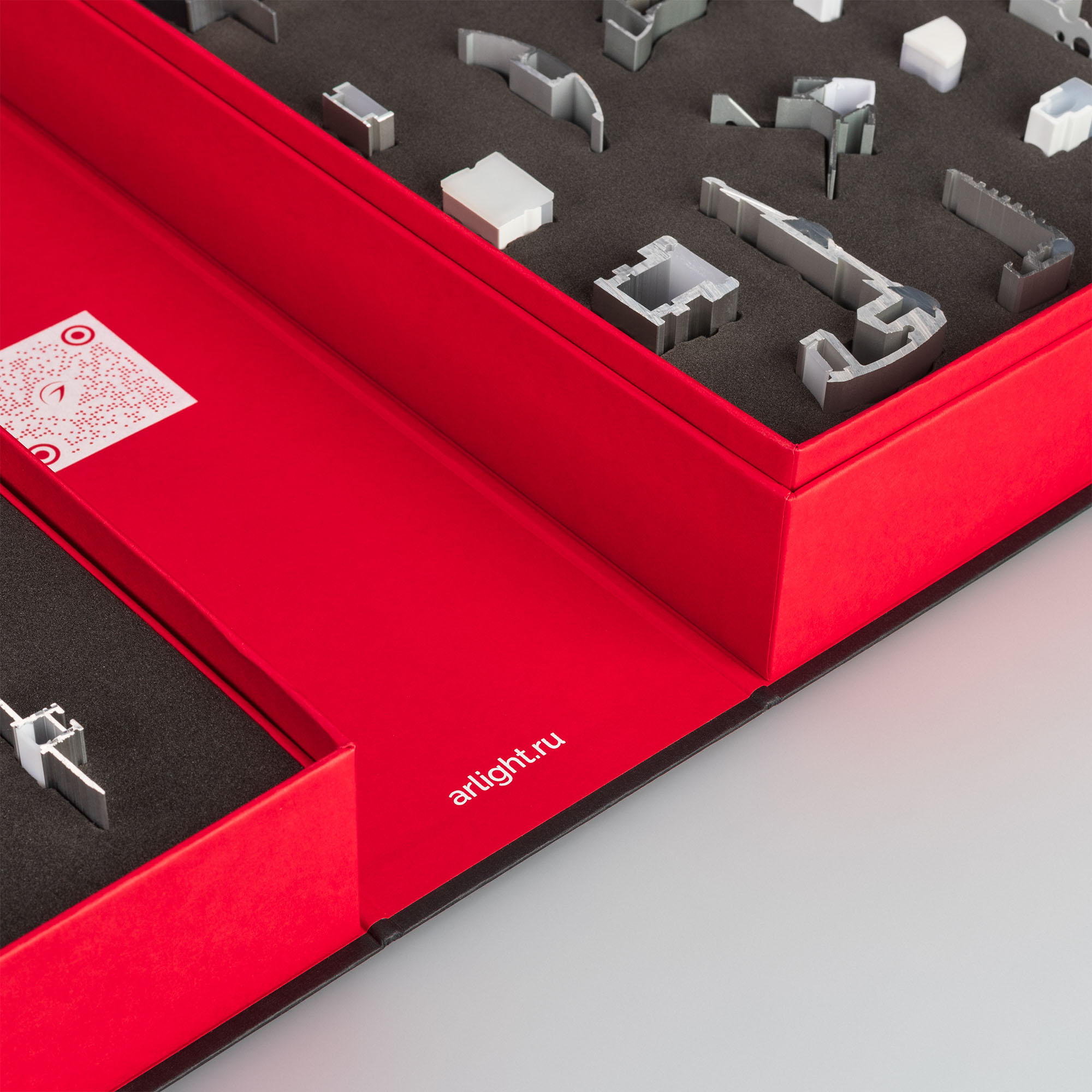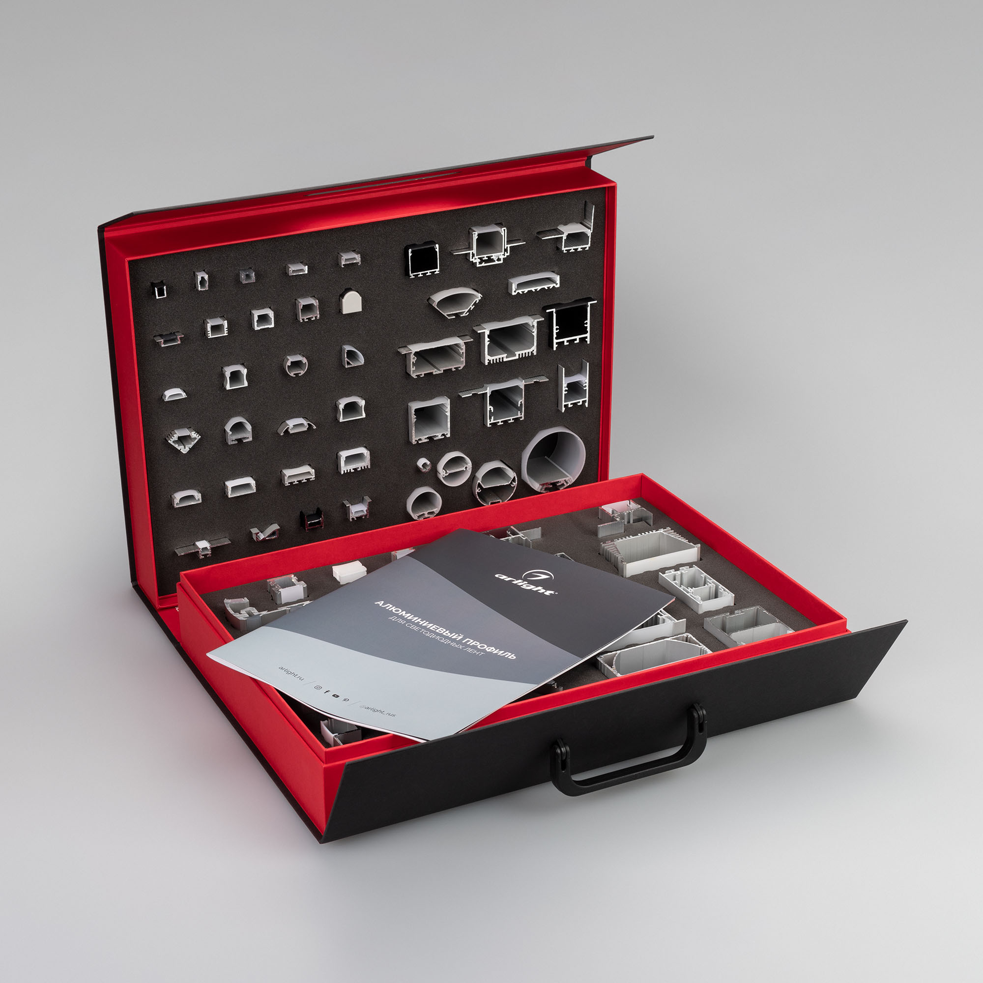 Демокейс содержит более 70 образцов профиля для основного и декоративного освещения, а также специализированный профиль. Предаставлены модели для накладного, встраиваемого и подвесного монтажа. В комплекте буклет с обзором представленных моделей.