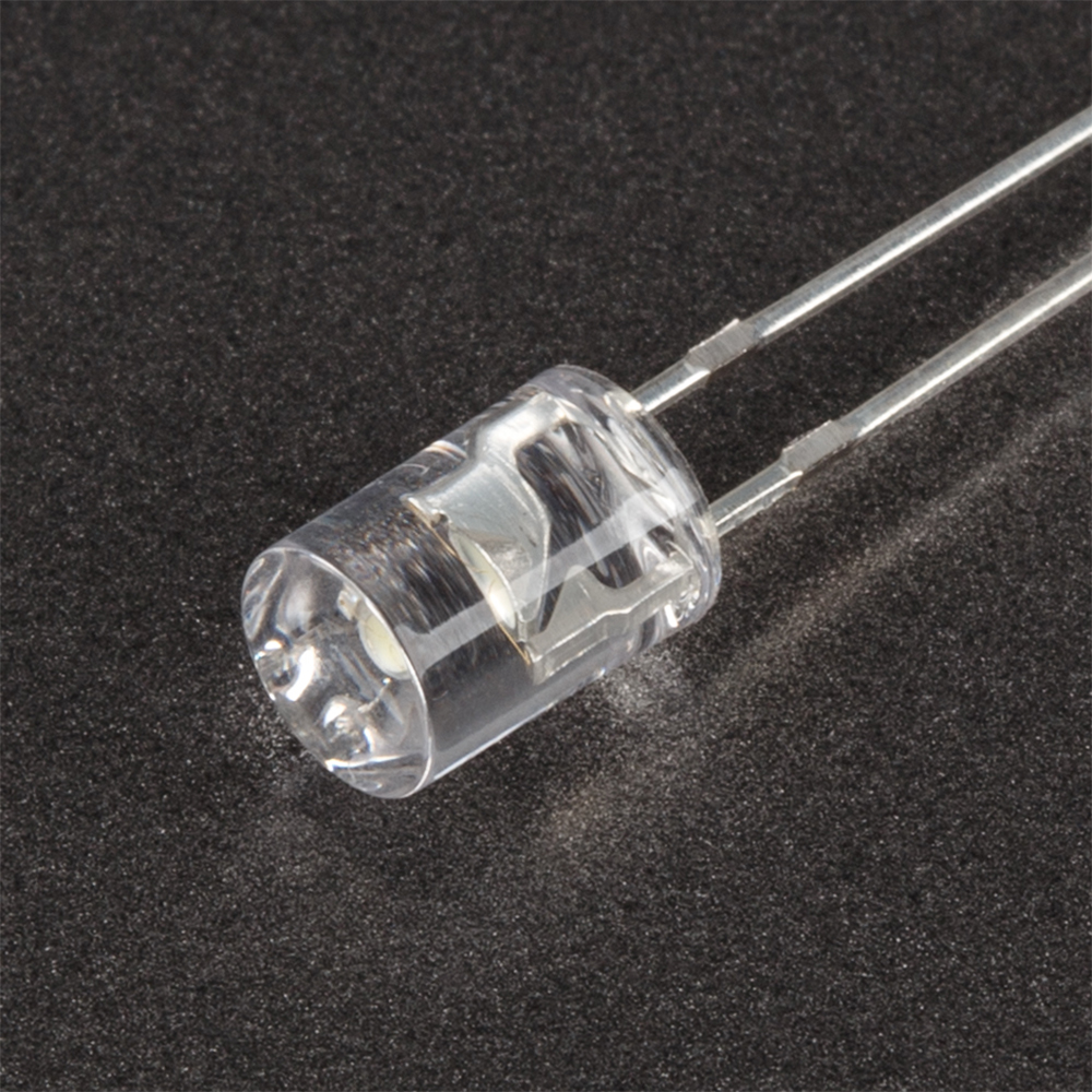 Поставка под заказ от 5000 шт. Выводной цилиндрический светодиод, d=5 мм, прозрачная линза с УФ-фильтром. Цвет свечения белый (6000-8000 К). Угол излучения 100°. Сила света Iv=2000-3600 мкд при If=20 мА. VF=2.9-3.5 В. Рекомендуемый постоянный рабочий ток <16-17 мА.