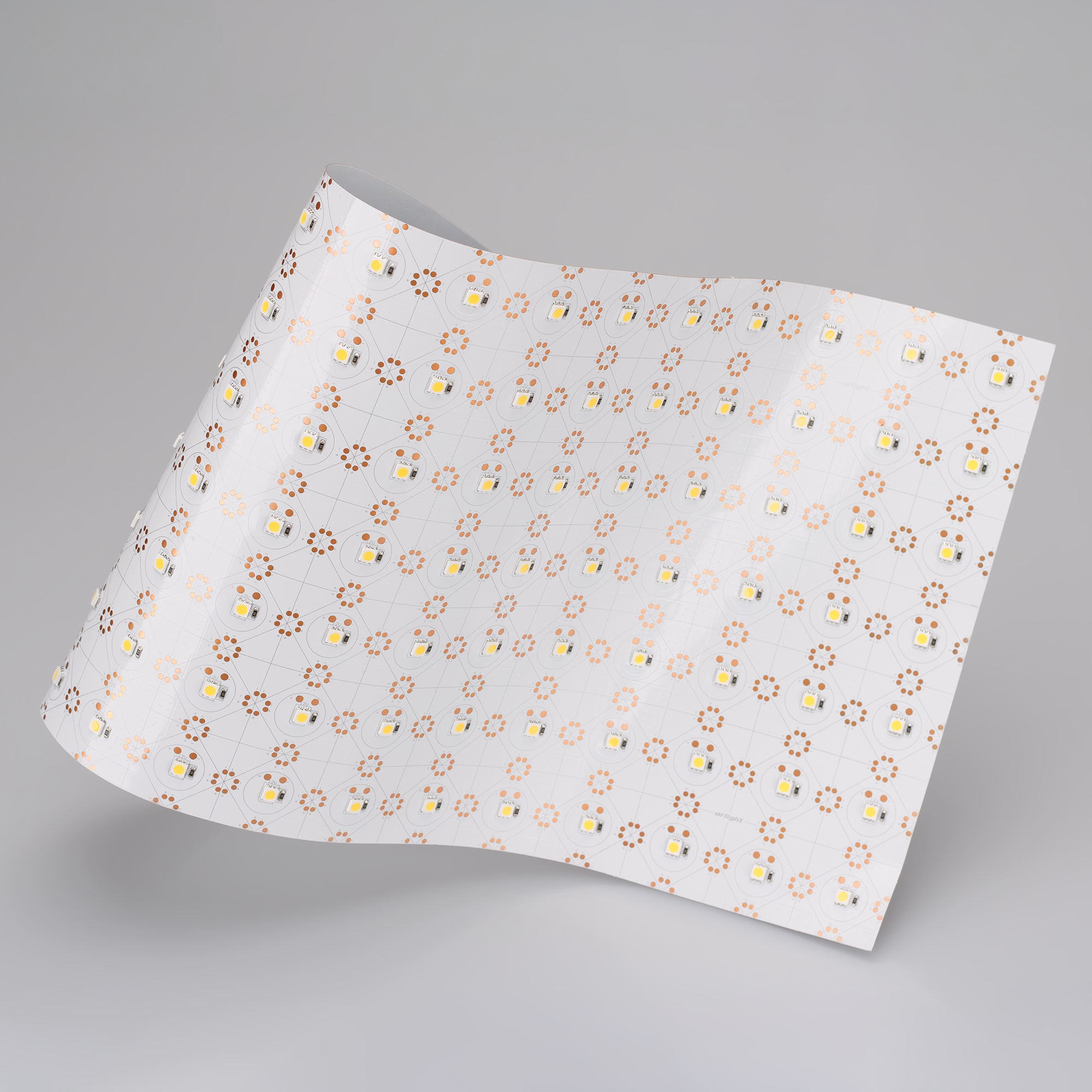 Светодиодный лист для равномерной подсветки большой площади. Светодиоды SMD 5060 (105 шт/м) красного цвета свечения. Мощность всего листа 22 Вт, одного сегмента — 0.2 Вт. Напряжение питания 12 В. Можно вырезать фигуры и буквы произвольной формы по линиям на плате. Подача питания в любой точке '+' и '−'. Минимальный сегмент 34×34 мм. Дополнительный теплоотвод не обязателен.