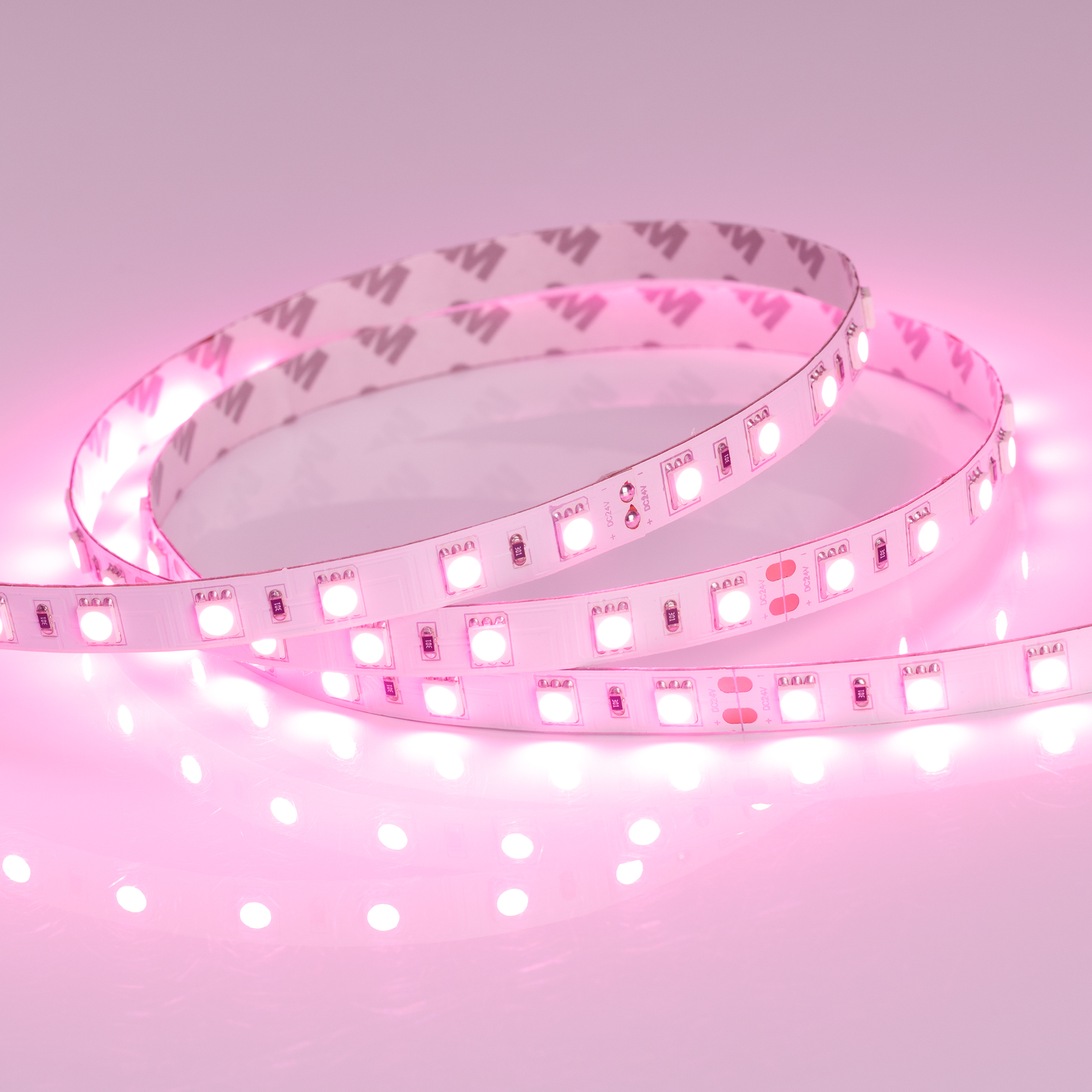 Гибкая лента LUX, светодиоды smd 5060, 60шт/м (300шт на 5м), белая плата 10мм, скотч 3М. Цвет РОЗОВЫЙ. Питание 24V, мощность 14.4 Вт/м (72 Вт на 5м), угол 120°. Размеры 5000х10x2.2мм. Мин.отрезок 100мм, 6 светодиодов. Цена за 1м.