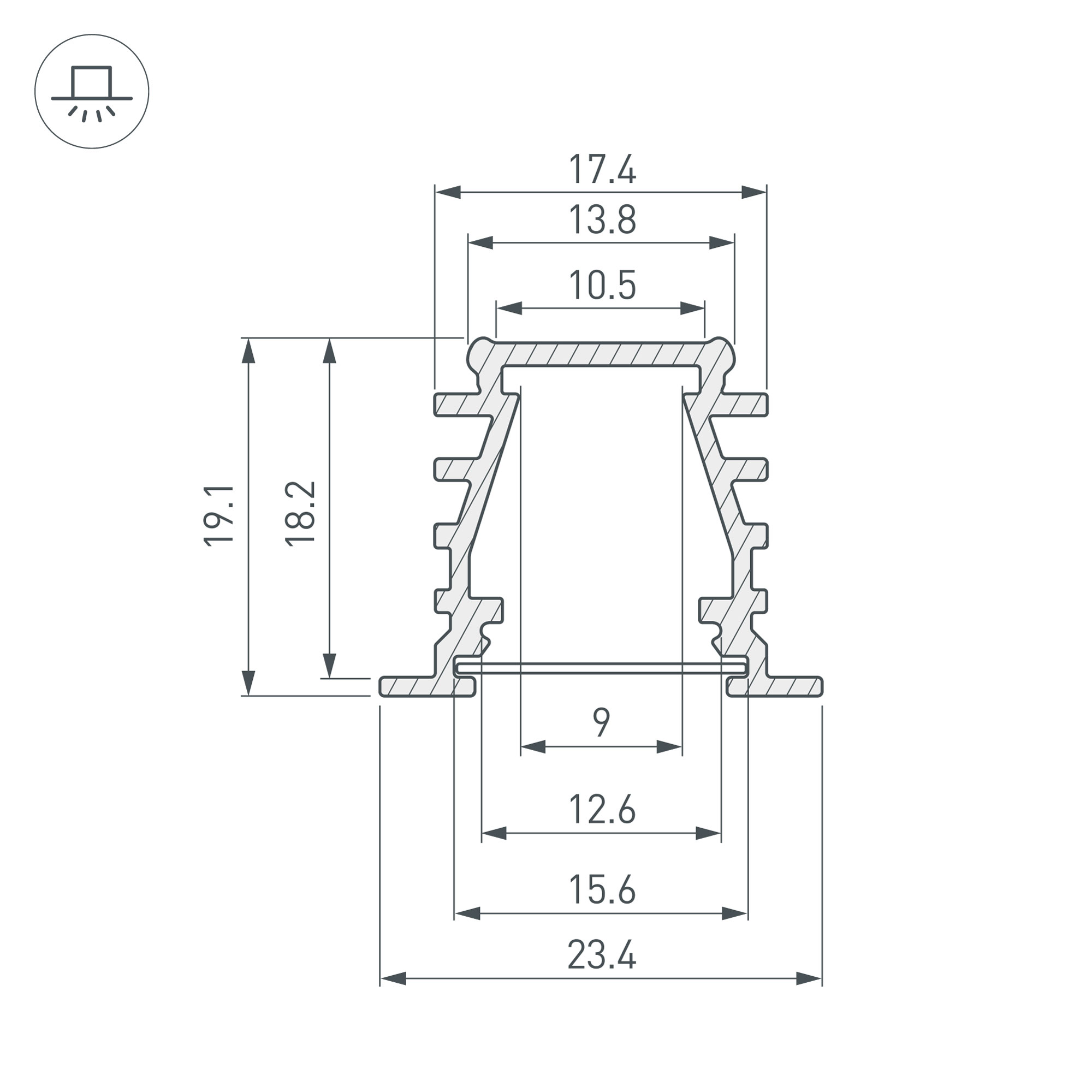 Встраиваемый профиль с накладным фланцем из анодированного алюминия для контурной подсветки. Габаритные размеры профиля составляют 2000 мм в длину, 23,4 мм в ширину и 19,1 мм в высоту. Площадка для установки светодиодных лент позволяет использовать ленту шириной до 9 мм и мощностью до 20,1 Вт/м. Это обеспечивает гибкость в выборе светодиодных лент и создает потрясающие световые решения. Экраны, заглушки и другие аксессуары не включены в комплект и приобретаются отдельно. Цена указана за 1 метр профиля. Отличное решение для создания современных световых проектов.