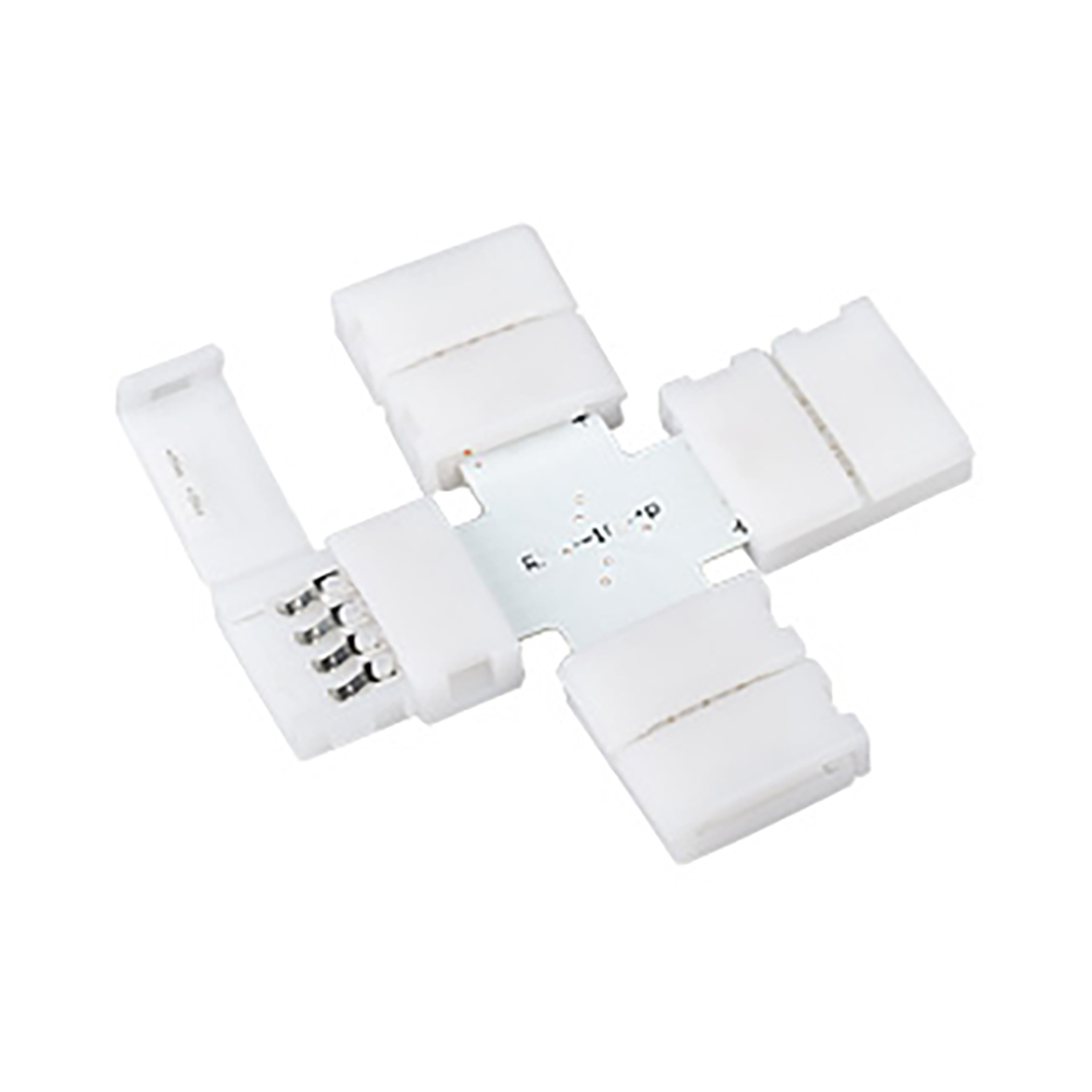 Разветвитель крестовой с разъемами на фиксаторах, для соединения RGB лент шириной 10мм. Максимальный допустимый ток 4А. Не рекомендуется соединять длинные отрезки лент!