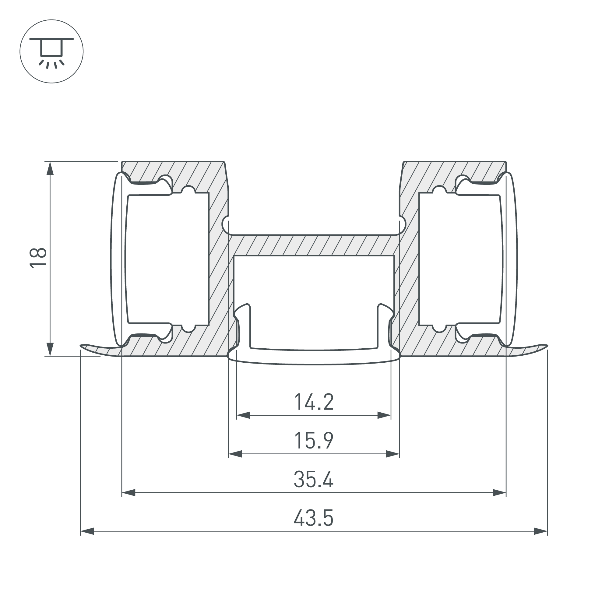 Габаритные размеры профиля составляют 2000 мм в длину, 43,5 мм в ширину и 18 мм в высоту. Площадки для установки светодиодных лент позволяют использовать ленты шириной до 12 мм и мощностью до 11 Вт/м каждая. Это обеспечивает гибкость в выборе светодиодных лент и создает потрясающие световые решения.