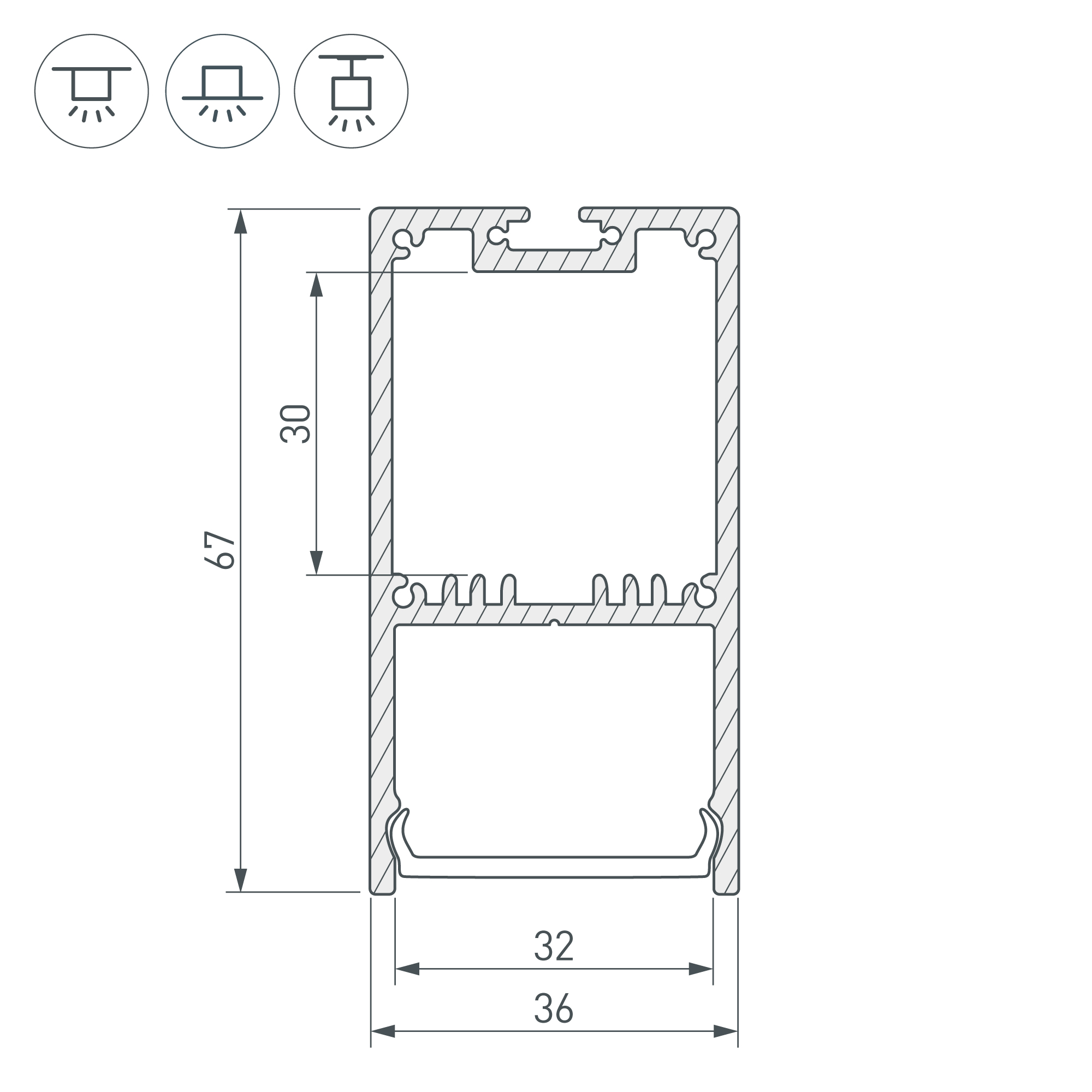 Подвесной/накладной/встраиваемый профиль из анодированного алюминия с отсеком для блока питания (30х32 мм) для контурной подсветки помещений. Габаритные размеры профиля составляют 2000 мм в длину, 36 мм в ширину и 67 мм в высоту. Площадка для установки светодиодных лент позволяет использовать ленту шириной до 32 мм и мощностью до 54 Вт/м. Это обеспечивает гибкость в выборе светодиодных лент и создает потрясающие световые решения.