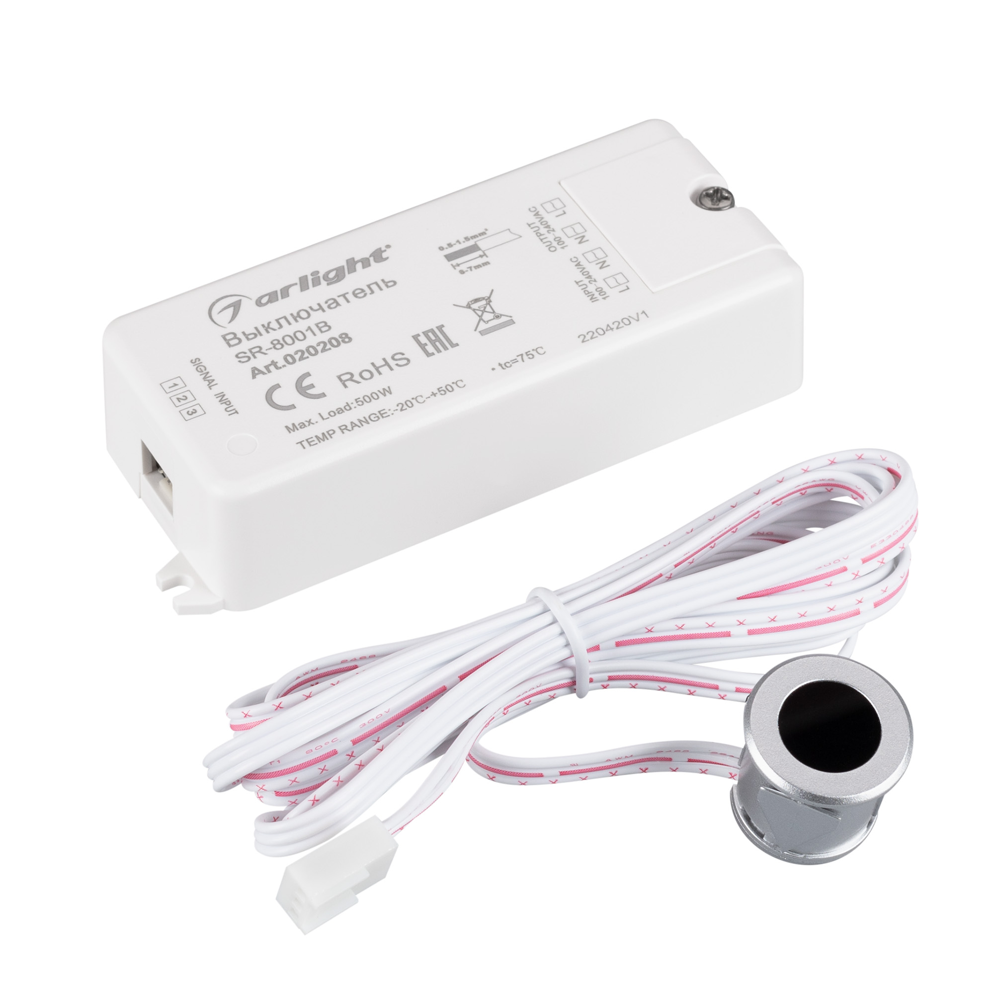 ИК-датчик SR-8001B Silver (220V, 500W, IR-Sensor) предназначен для бесконтактного включения и выключения ламп и др. источников света с напряжением 220 В и мощностью до 500 Вт. Благодаря малым размерам 20х20 мм, датчик серебристого цвета легко встраивается в мебель, полки и др. конструкции. Блок управления расположен отдельно от датчика и имеет размеры 82×33×20 мм, длина провода составляет 1,5 м. Включение света происходит при открытии дверцы на расстоянии 1-6 см, а выключение - при закрытии. Отличное решение при организации подсветки в гардеробах, шкафах, совместим с мебельными светильниками Arlight.