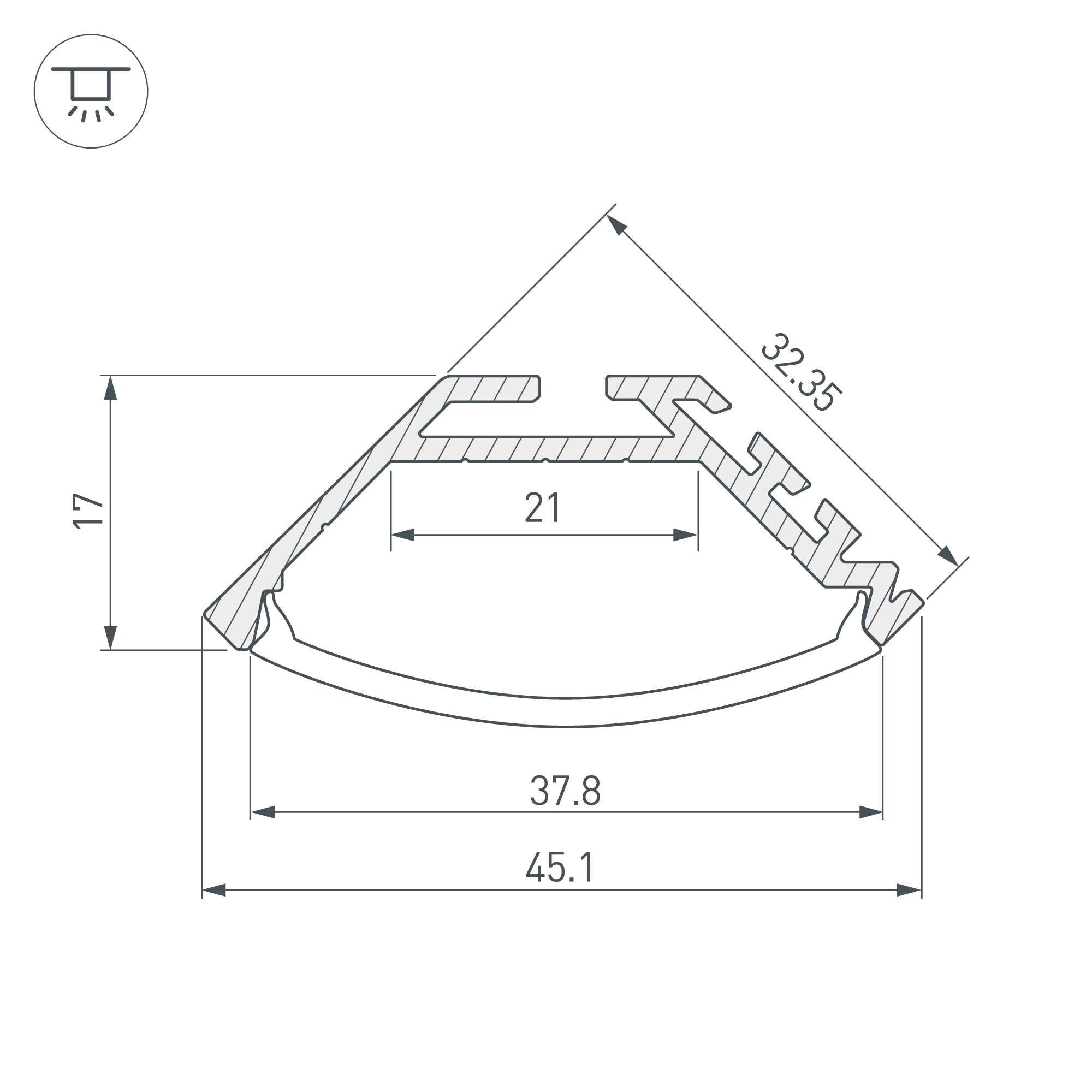 Угловой профиль из анодированного алюминия для подсветки мебели, ниш и других элементов интерьера. Усеченный угол профиля позволяет достичь высокой точности установки при любых неровностях. Габаритные размеры профиля составляют 2000 мм в длину, 45,1 мм в ширину и 17 мм в высоту. Площадка для установки светодиодных лент позволяет использовать ленту шириной до 21 мм и мощностью до 28,2 Вт/м. Это обеспечивает гибкость в выборе светодиодных лент и создает потрясающие световые решения.