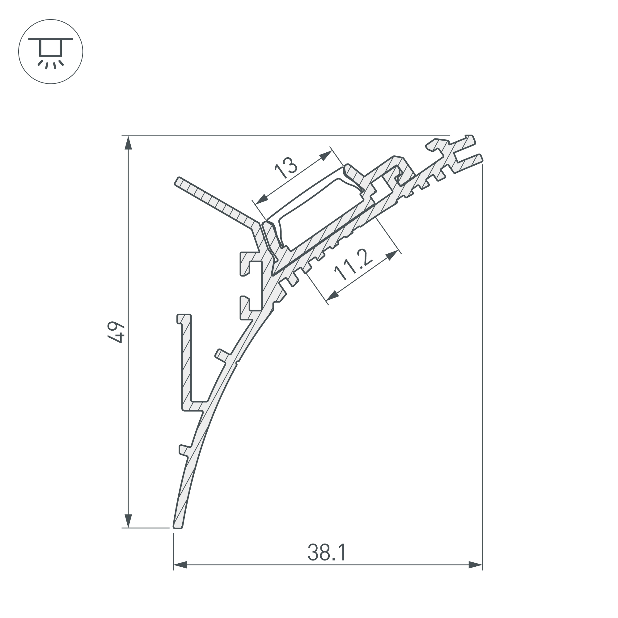 Двухкомпонентный накладной алюминиевый профиль (возможен монтаж под строительную отделку) для подсветки стен и потолков. Габаритные размеры профиля составляют 2000 мм в длину, 38,1 мм в ширину и 19 мм в высоту. Площадка для установки светодиодных лент позволяет использовать ленту шириной до 11,2 мм и мощностью до 13,9 Вт/м. Это обеспечивает гибкость в выборе светодиодных лент и создает потрясающие световые решения.