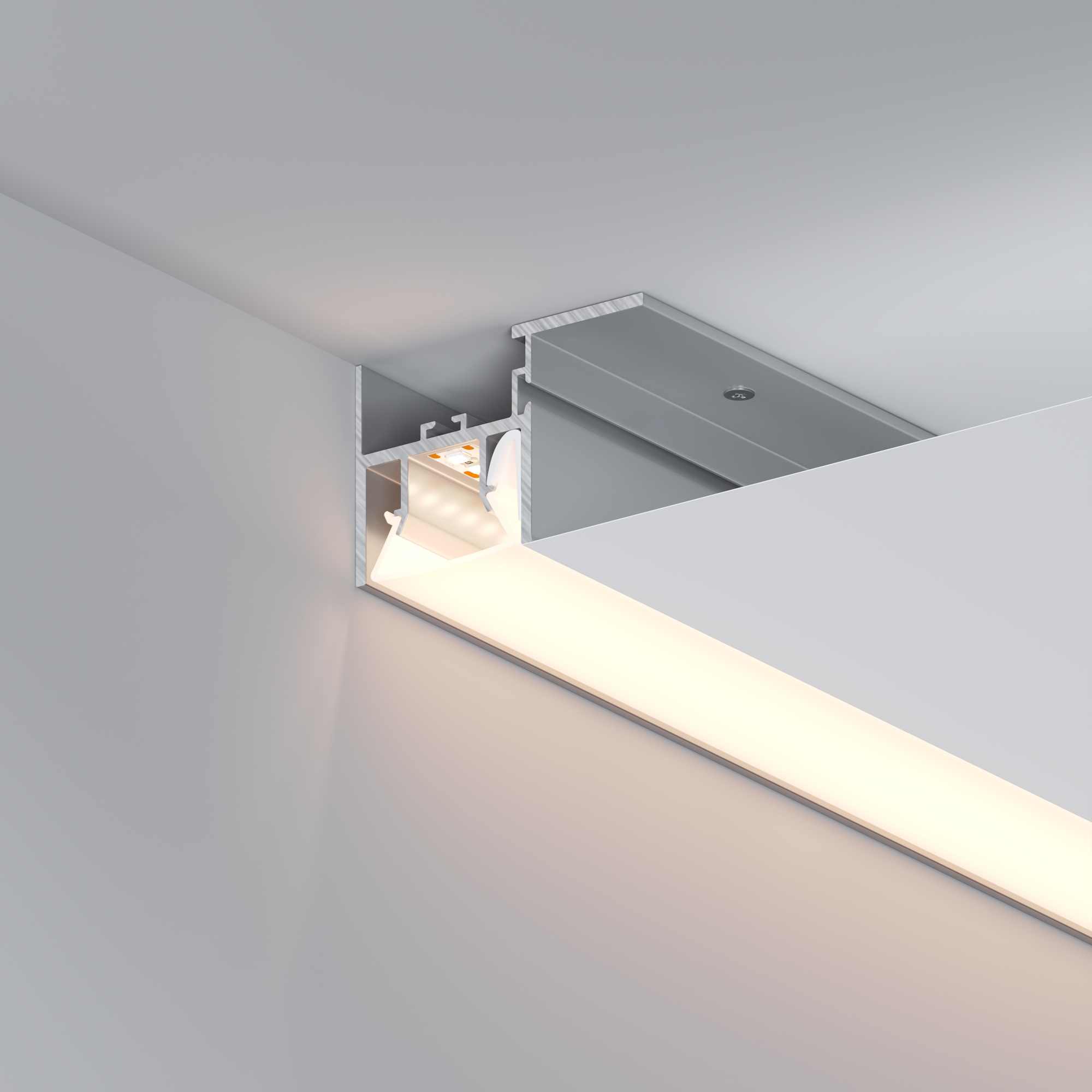 Встраиваемый алюминиевый профиль (боковая линия - монтаж к потолку) для дизайнерских решений «линии света» в натяжных потолках. Решение 2-в-1: служит каркасом для крепления натяжного потолка и профилем для установки светодиодной ленты.