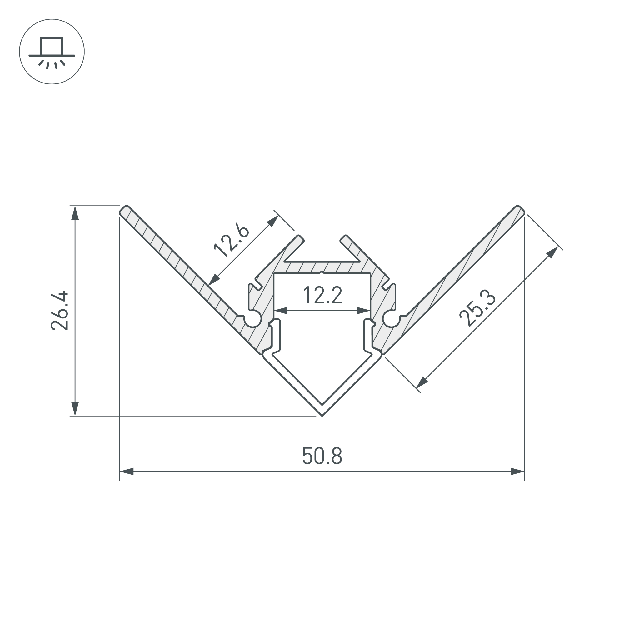Габаритные размеры этого профиля составляют 2000 мм в длину, 50,8 мм в ширину и 21 мм в высоту. Площадка для установки светодиодных лент позволяет использовать ленту шириной до 12 мм и мощностью до 30 Вт/м. Это обеспечивает гибкость в выборе светодиодных лент и создает потрясающие световые решения.