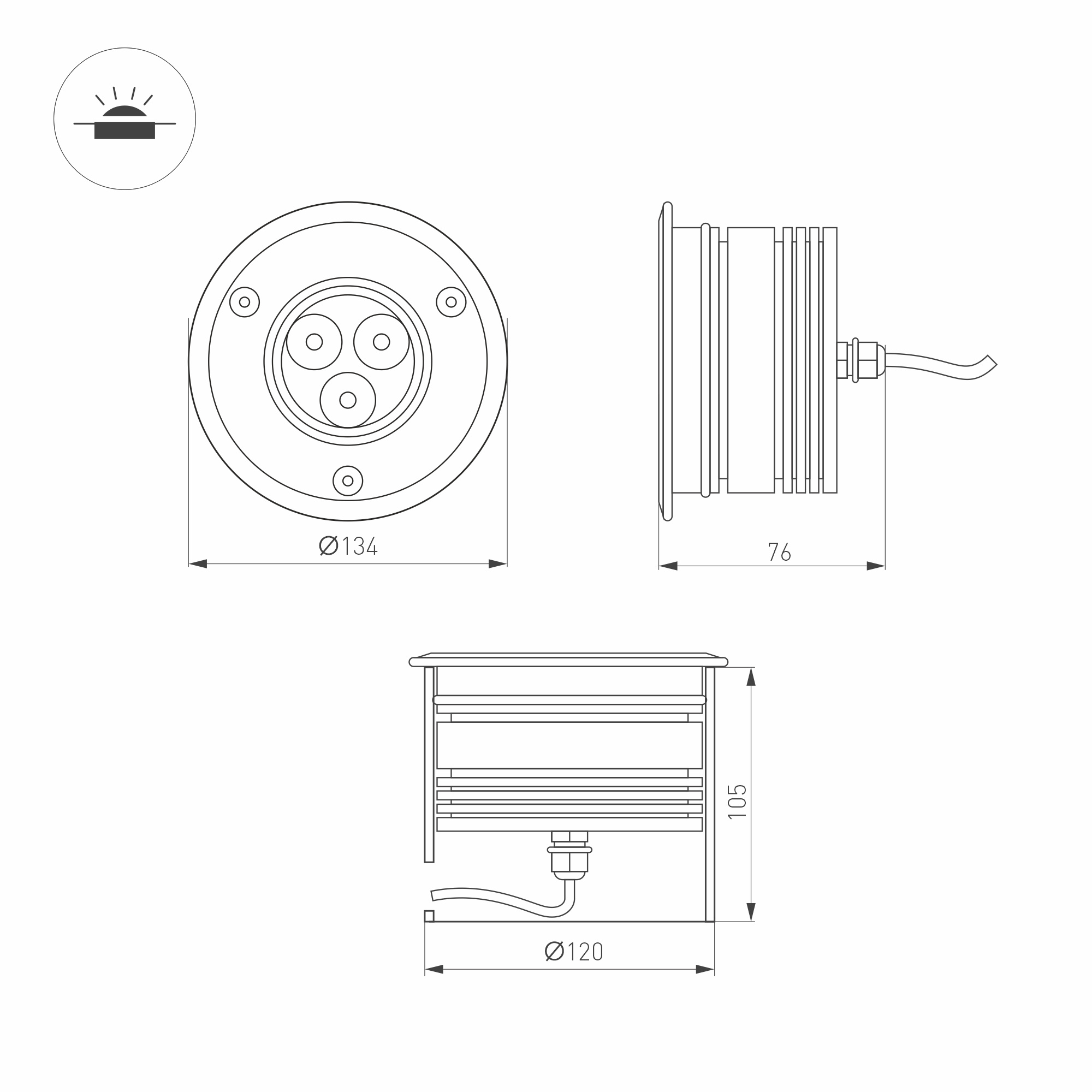 Встраиваемый светодиодный светильник GROUND-TURN мощностью 9 Вт мульти цветного свечения RGB, со световым потоком 310 лм предназначен для ландшафтного освещения парковых и садовых дорожек, придомовых территорий, а также декоративной подсветки фасадов, лестниц. Узкий угол излучения с изменяемым углом наклона светового потока позволяет создать четкий акцент на подсвечиваемом объекте и легко отрегулировать нужное направление луча в ручную. Ударопрочный круглый корпус из нержавеющей стали с экраном из закаленного стекла толщиной 8мм надежно защищают оптический блок от внешних воздействий. Степень пылевлагозащиты корпуса IP67 рассчитана на длительное использование на открытом воздухе, а так же обеспечивает надежную работу в неблагоприятных условиях. Светильник может работать как в статичном режиме, так и в режиме динамической смены цвета. Для управления и подключения используются совместимые контроллеры ШИМ или DMX512 и блок питания постоянного напряжения 24В (приобретаются отдельно).