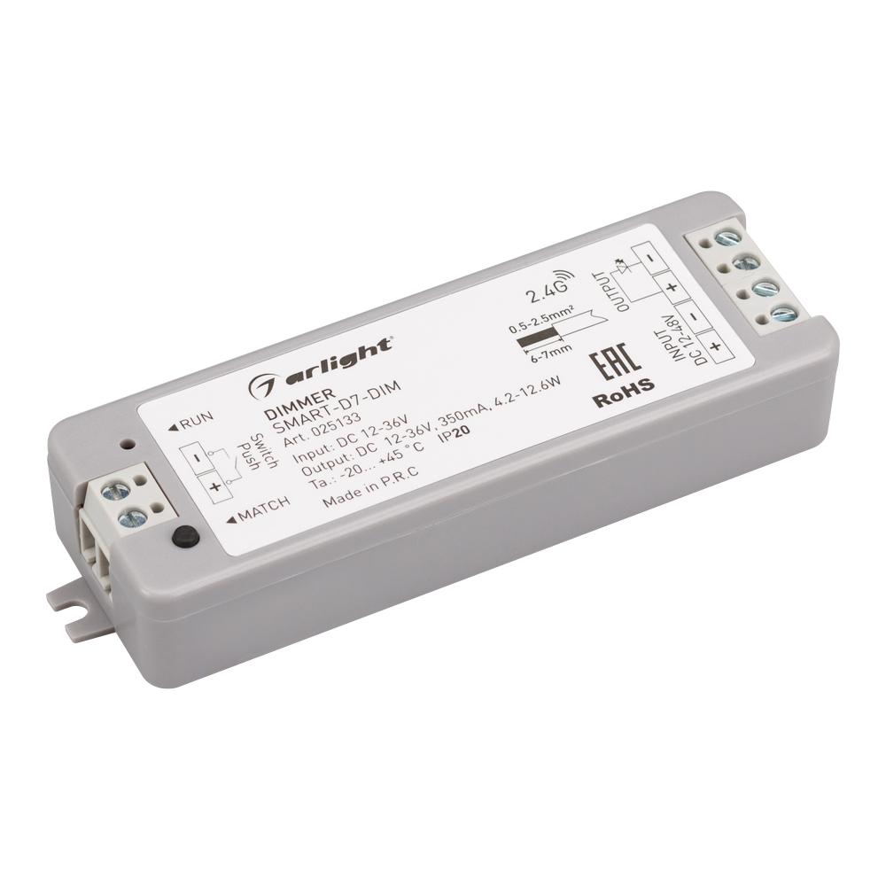 Диммер тока для светильников. Питание/рабочее напряжение 12-36VDC, максимальный ток 350mA на канал, 1 канал, максимальная мощность 4.2-12.6W. Винтовые клеммы. Корпус - PVC. Габариты 97x33x18 мм. Управляется пультами и панелями серии SMART (поставляются отдельно).