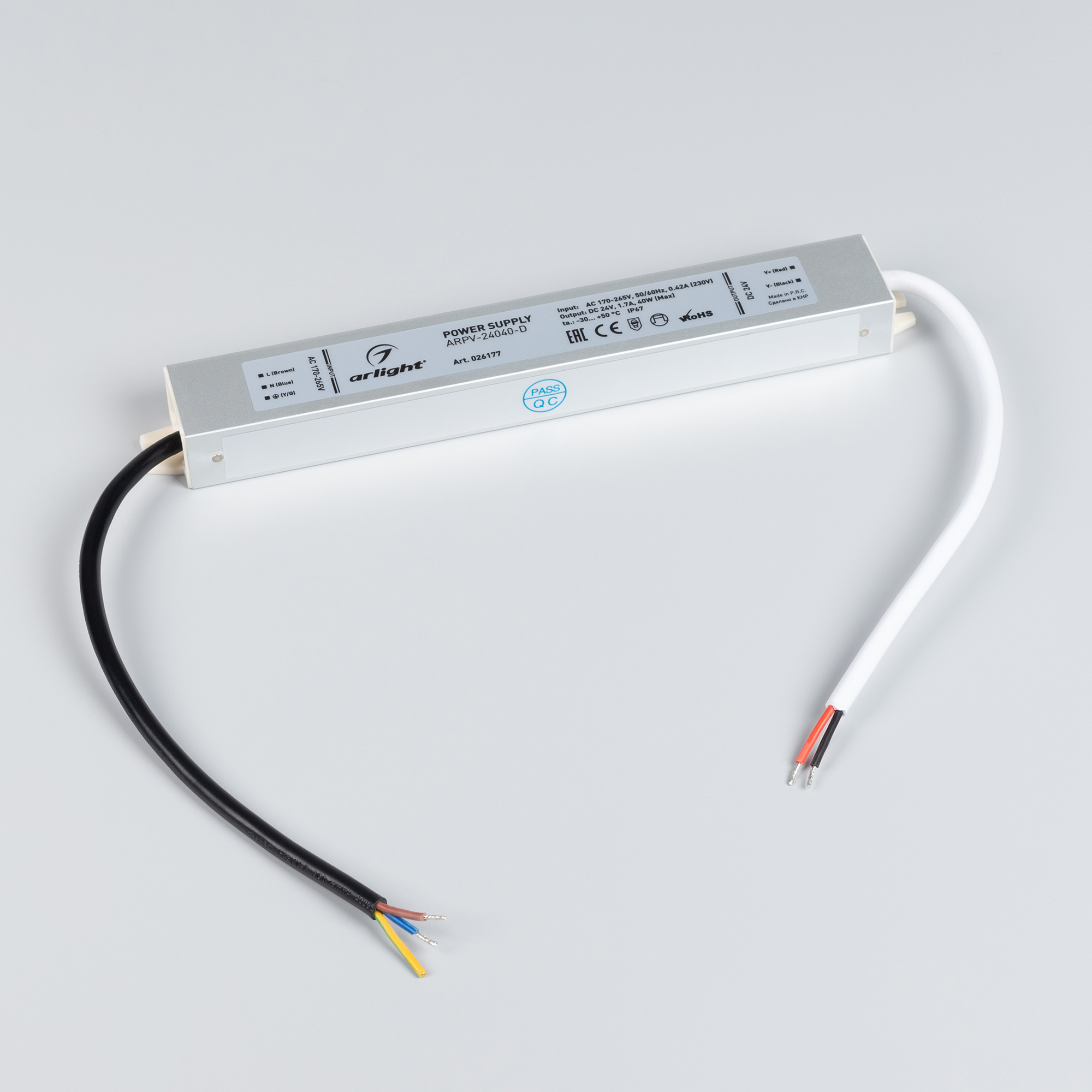 Источник напряжения с гальванической развязкой для светодиодных изделий. Входное напряжение 170-265 VAC. Выходные параметры: 24 В, 1,7 А, 40 Вт. Герметичный алюминиевый корпус IP 67. Рабочая температура -30…+50C⁰. Габаритные размеры длина 217 мм, ширина 30 мм, высота 20 мм. Гарантийный срок 3 года.