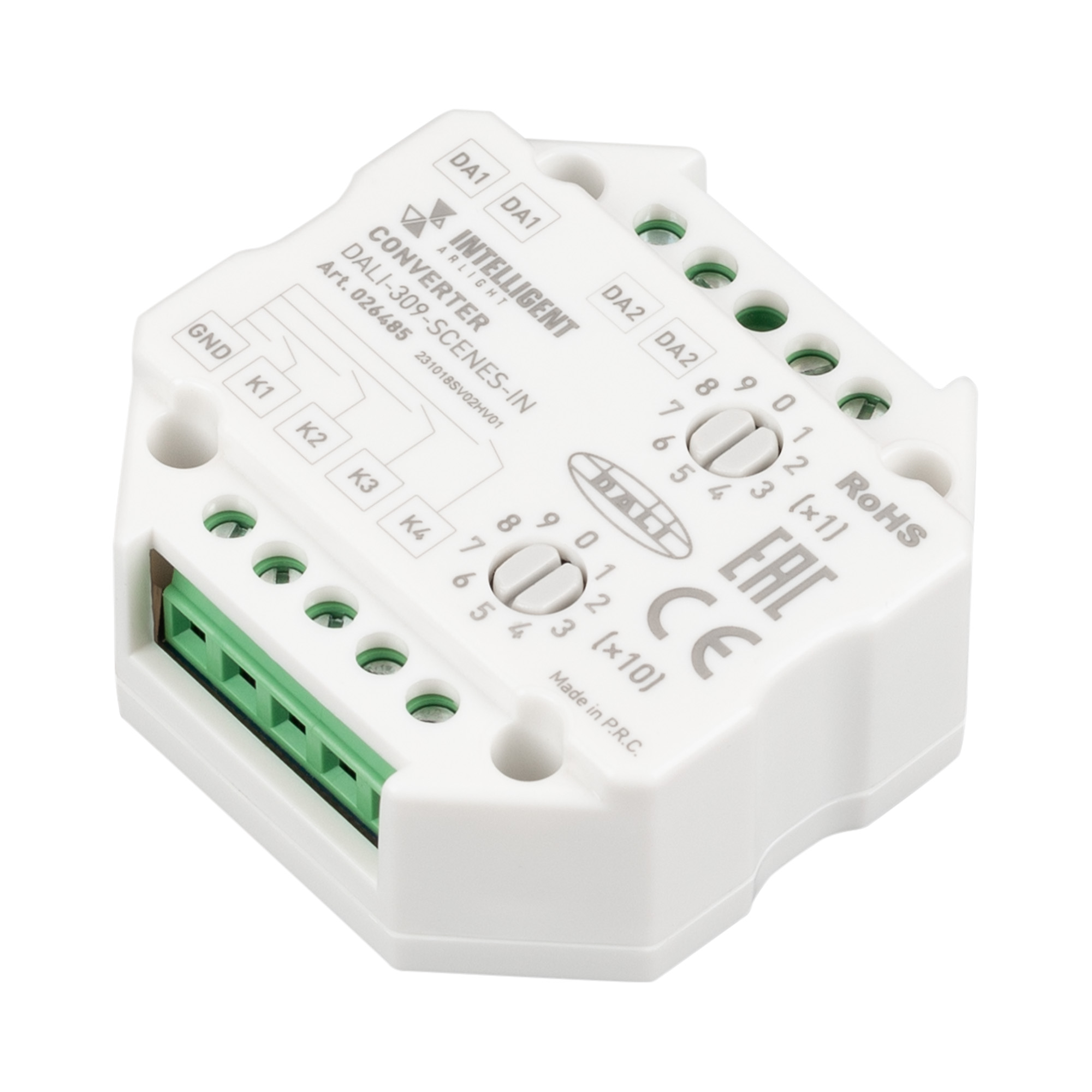 Конвертер сигнала от внешних кнопок в цифровой сигнал DALI. Устройство предназначено для управления в системах освещения DALI 4-мя сценами. Номер сцены устанавливается вращающимся переключателем на корпусе конвертера. Питание устройства от шины DALI, внешнее питание не требуется. Габариты конвертера составляют 51x51x22мм, корпус белого цвета, удобная установка в стандартную монтажную коробку.
