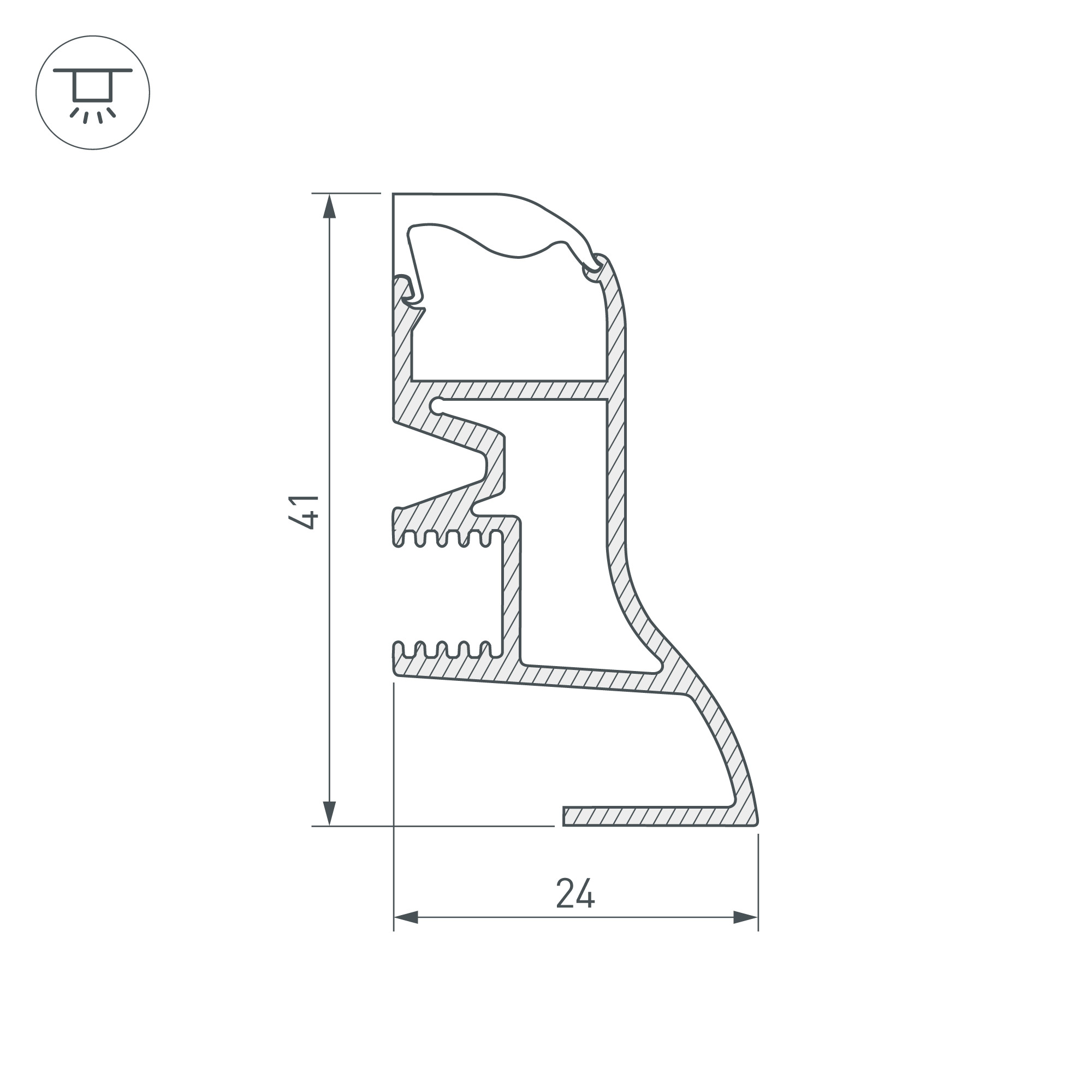 Накладной профиль-плинтус из анодированного алюминия для контурной подсветки помещения. Габаритные размеры этого профиля составляют 2000 мм в длину, 24 мм в ширину и 41 мм в высоту. Площадка для установки светодиодных лент позволяет использовать ленту шириной до 12 мм и мощностью до 27 Вт/м. Это обеспечивает гибкость в выборе светодиодных лент и создает потрясающие световые решения.