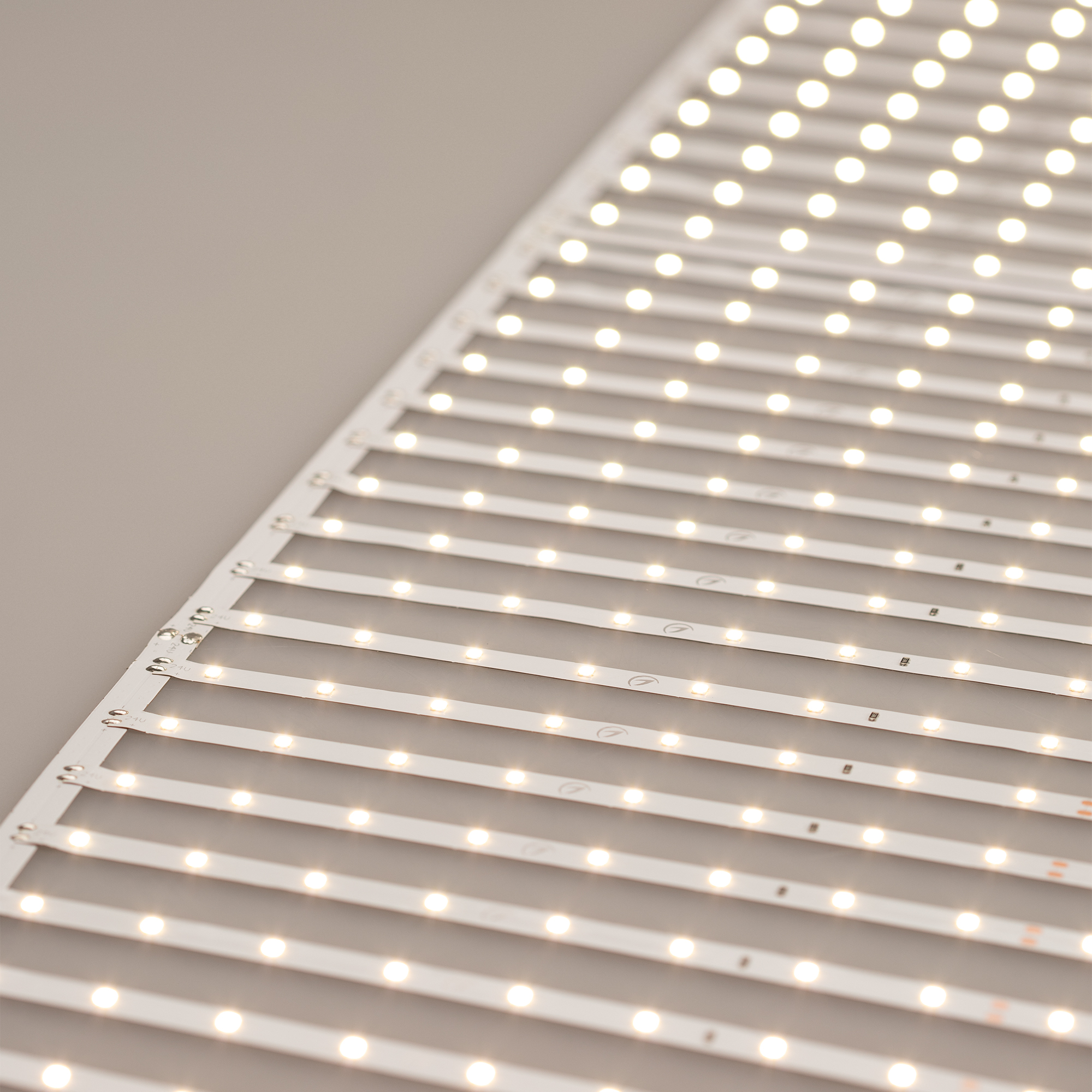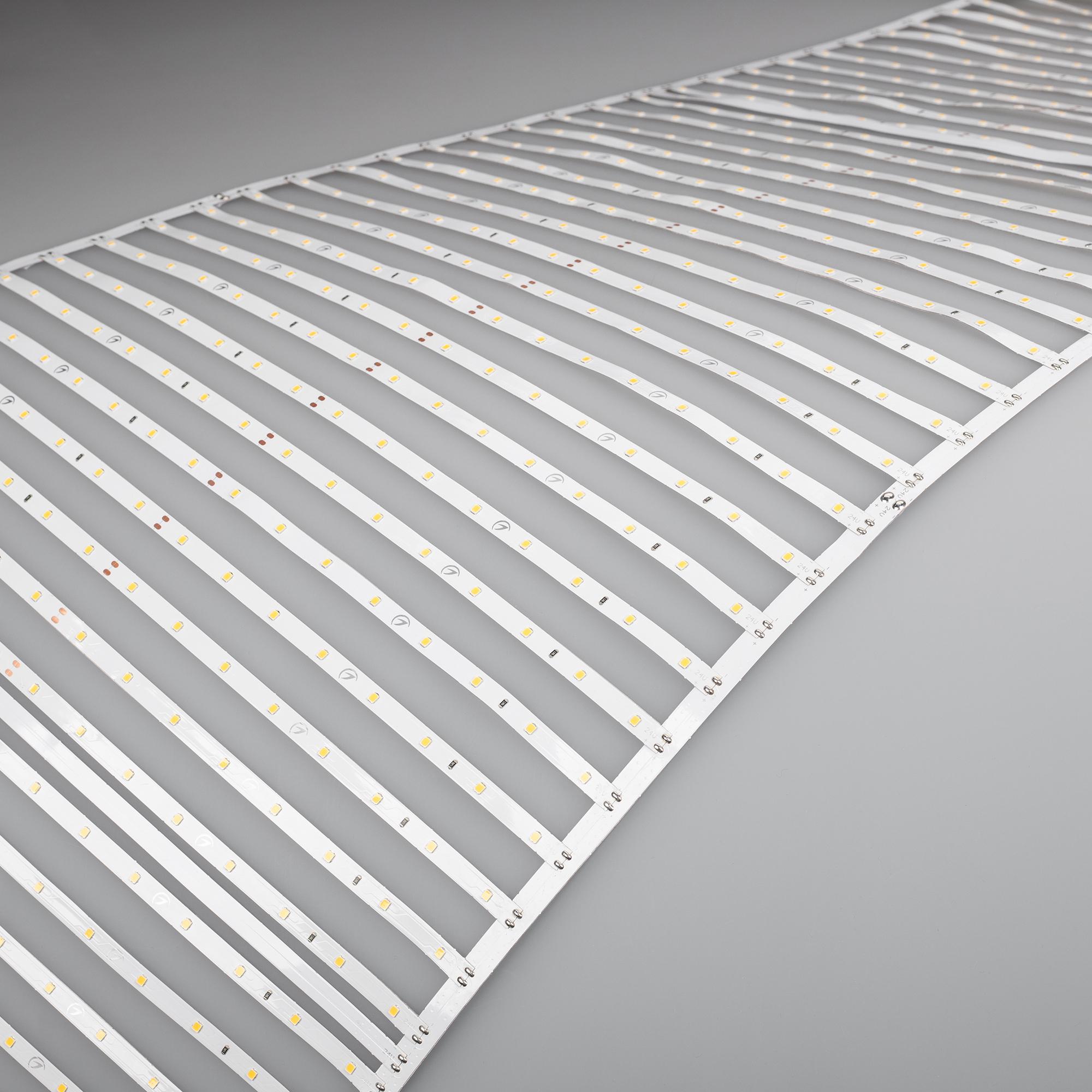 Лента-сеть из 6 сегментов по 20 линий, соединенных между собой платой. Общая длина сети 3000 мм, что позволяет делать подсветку больших поверхностей: потолков, стен, ниш, колонн. Светодиоды SMD 2835 (640 шт/м) дневного белого цвета свечения (3900–4000 К) с индексом цветопередачи CRI>85 и высокой световой эффективностью. Мощность 43.6 Вт/м, напряжение питания 24 В. Шаг резки 500 мм. Быстрый монтаж на основу-скотч 3М и простое подключение. Дополнительный теплоотвод не обязателен.