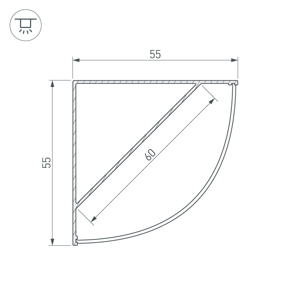 Алюминиевый анодированный угловой профиль для светодиодных лент и линеек. Габаритные размеры (L×W×H): 2000x55x55 мм. Ширина площадки для ленты 60 мм. Экраны, заглушки и другие аксессуары приобретаются отдельно. Цена за 1 метр.
