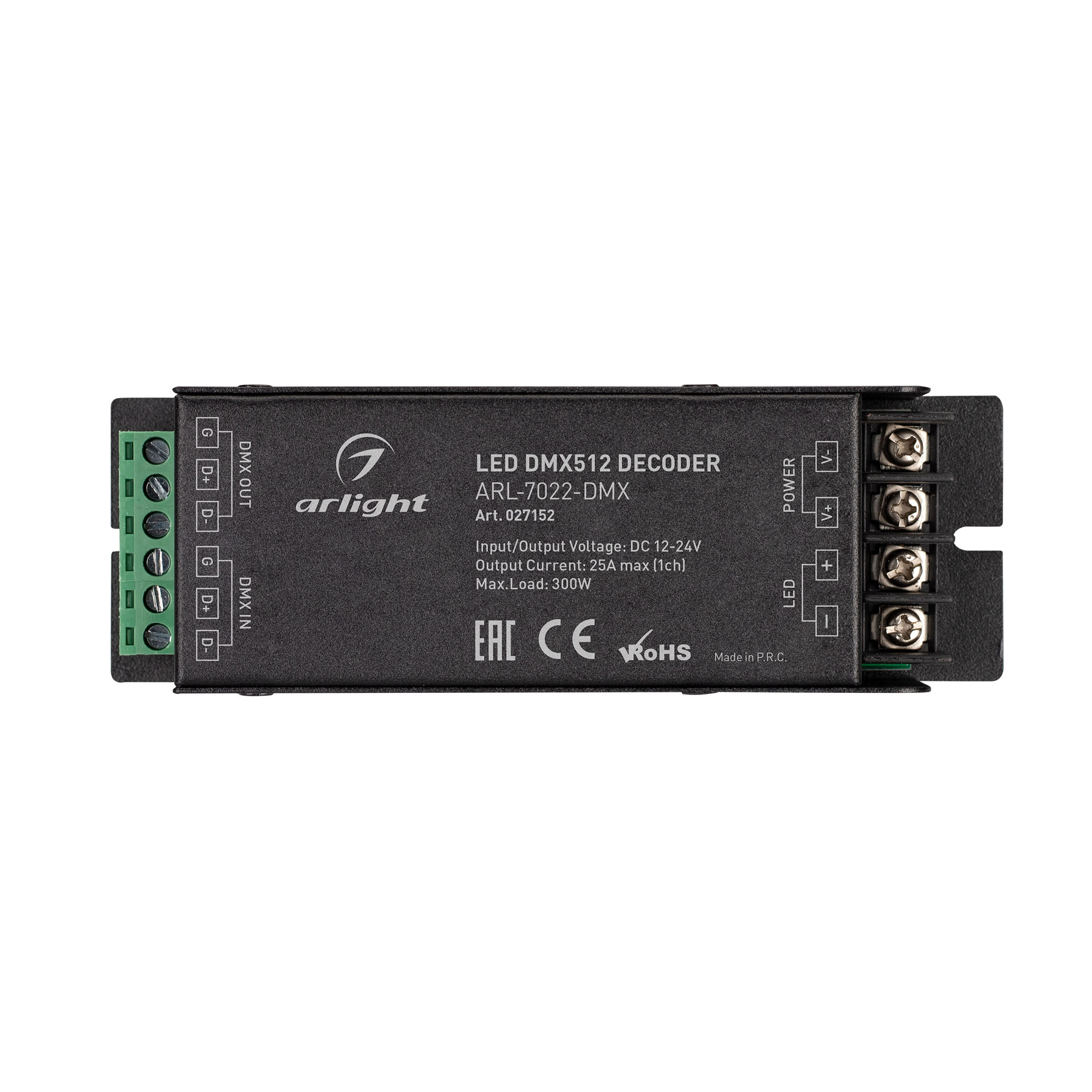 Мощный декодер (преобразователь) цифрового сигнала DMX512 в ШИМ для управления светодиодными лентами. Декодер может регулировать яркость одноцветных лент, осуществлять включение и выключение света. Декодер совместим с панелями управления с выходом DMX512 и контроллерами DMX512. Также, управление декодером осуществляется dip-переключателями на корпусе. Питание декодера имеет диапазон напряжений от 12В до 24В, максимальный ток 25А на 1 канал, максимальная мощность 300-600Вт (в зависимости от напряжения питания), 1 канал управления. Габариты декодера составляют 127х42х33мм, металлический корпус чёрного цвета.