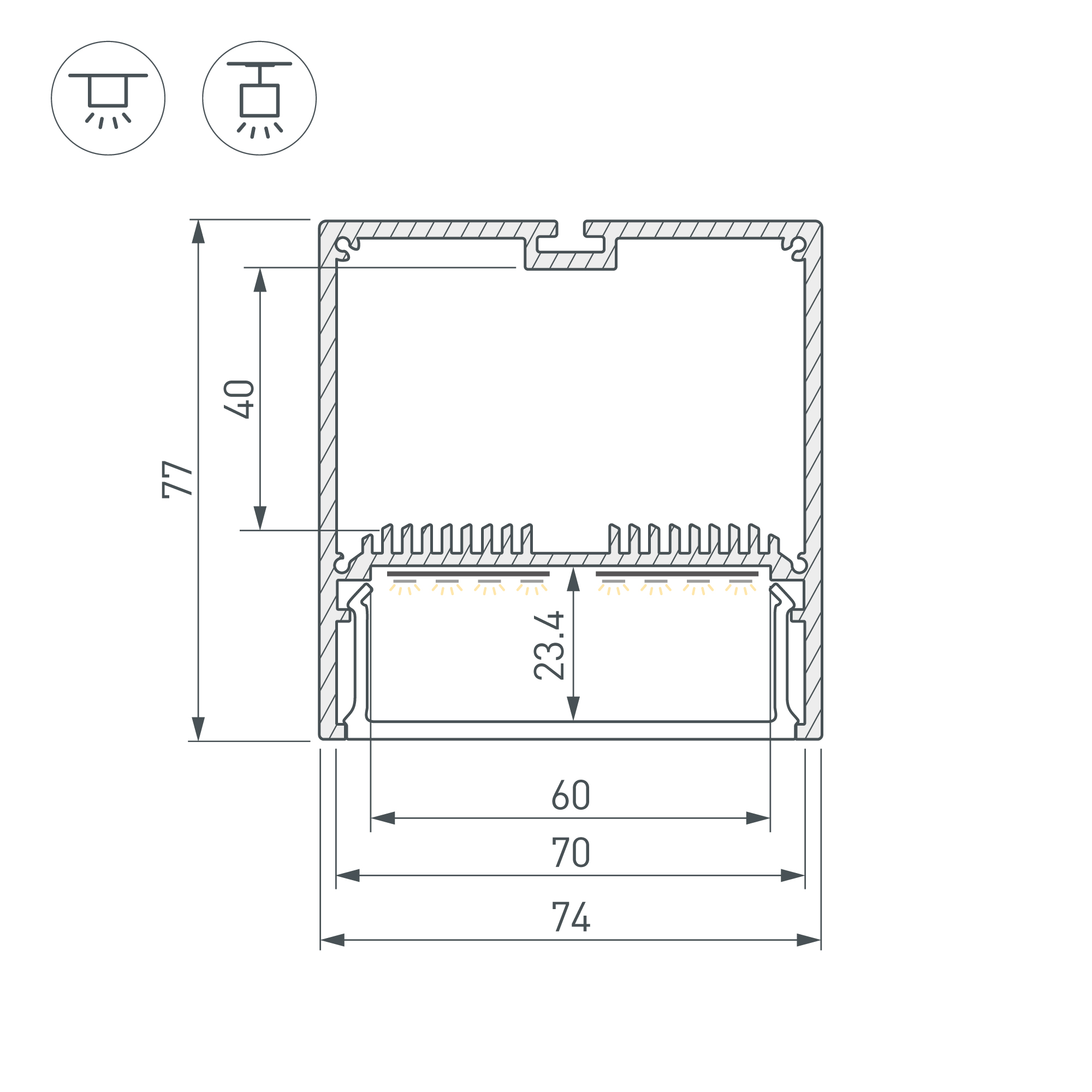 Габаритные размеры профиля составляют 2500 мм в длину, 74 мм в ширину и 77 мм в высоту. Площадка для установки светодиодных лент позволяет использовать ленту шириной до 60 мм и мощностью до 79,2 Вт/м. Это обеспечивает гибкость в выборе светодиодных лент и создает потрясающие световые решения. Монтаж осуществляется накладным либо подвесным способом. Для накладного монтажа на держатель 019911 на 1 метр профиля рекомендуем использовать не менее 5-ти держателей.