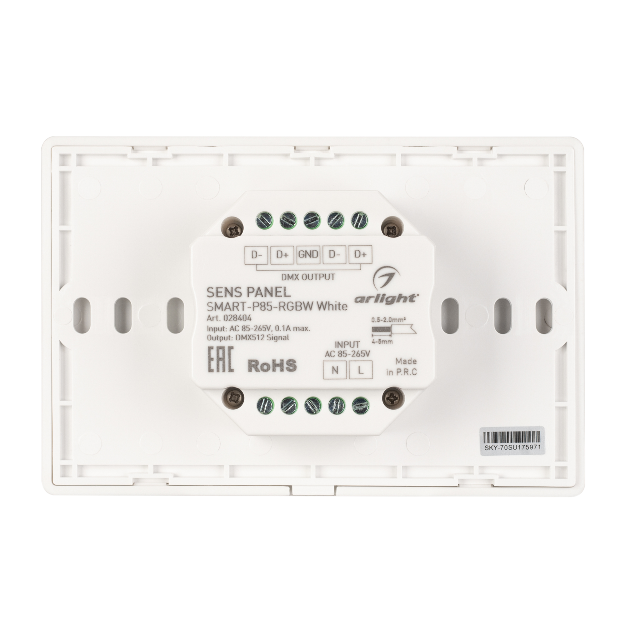 Встраиваемая сенсорная панель в "итальянском" стиле, изготовленная из высококачественного стекла, защищенного от появления царапин. Изделие позволяет осуществлять основные функции управления светом: включение/выключение, регулировка яркости, управление цветом (RGBW), сохранение предустановок для 4 световых зон. Панель совместима с диммерами и контроллерами SMART по радиоканалу 2.4G (количество привязываемых диммеров и контроллеров не ограничено) и может управлять DMX-диммерами по проводной шине DMX512. Выходной сигнал DMX соответствует стандартному протоколу DMX512 и совместим с оборудованием DMX любого производителя. Панель белого цвета, питание от сети 230В. Габариты устройства 120х80х37 мм, встраивается в стандартную монтажную коробку.