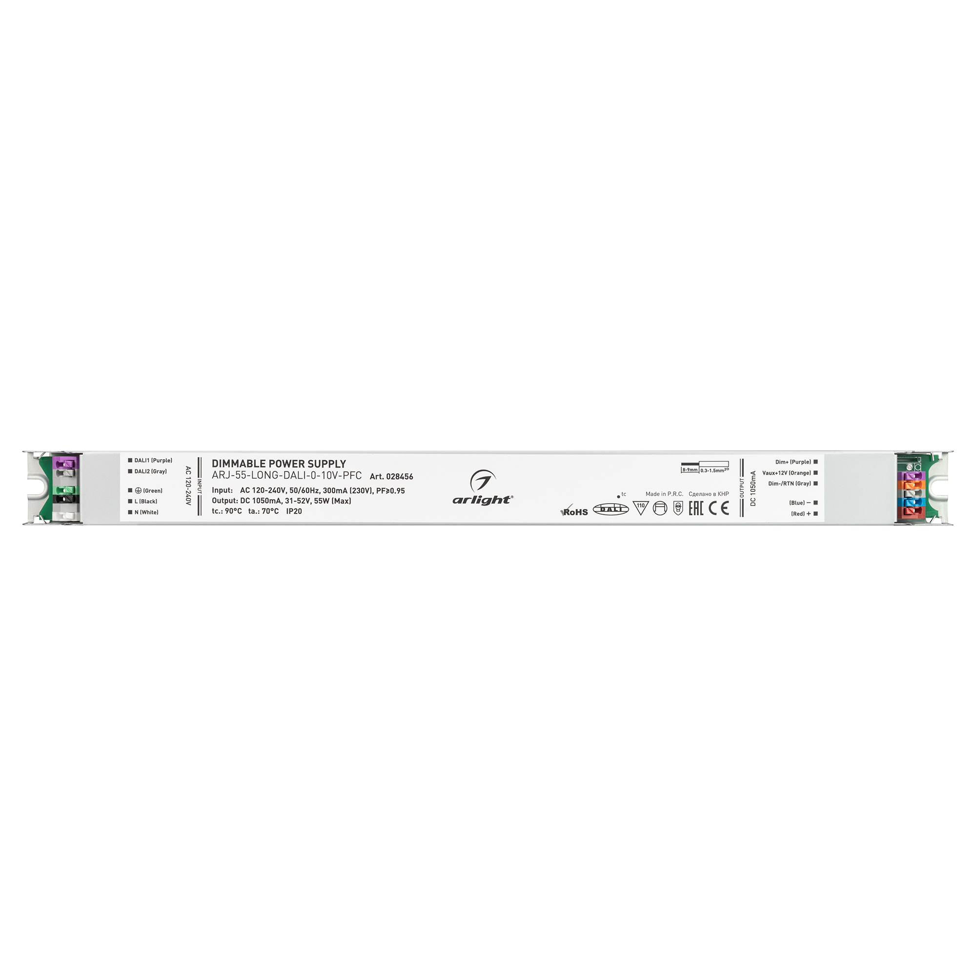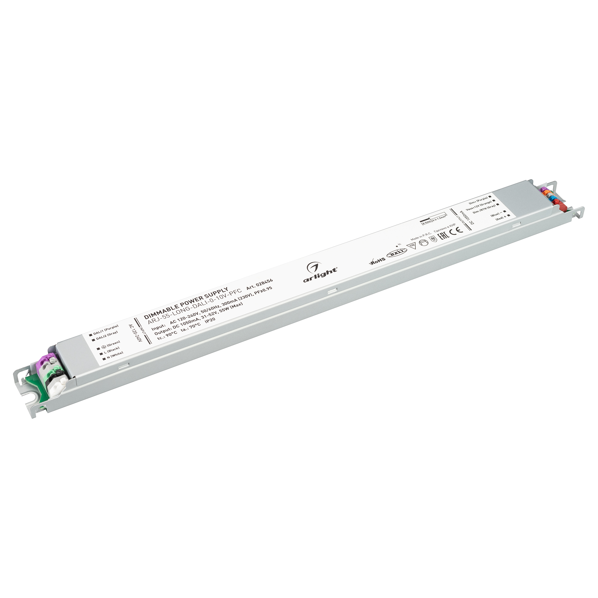 Поставка под заказ от 336 шт. Диммируемый источник тока по протоколу DALI, стандарту 0-10 В с гальванической развязкой для светильников и мощных светодиодов. Входное напряжение 120-240 VAC. Выходные параметры: 31-52 В, 1050 mА, 55 Вт. Встроенный PFC >0.95. Негерметичный алюминиевый корпус IP 20. Габаритные размеры длина 378 мм, ширина 30 мм, высота 21 мм. Гарантийный срок 7 лет.