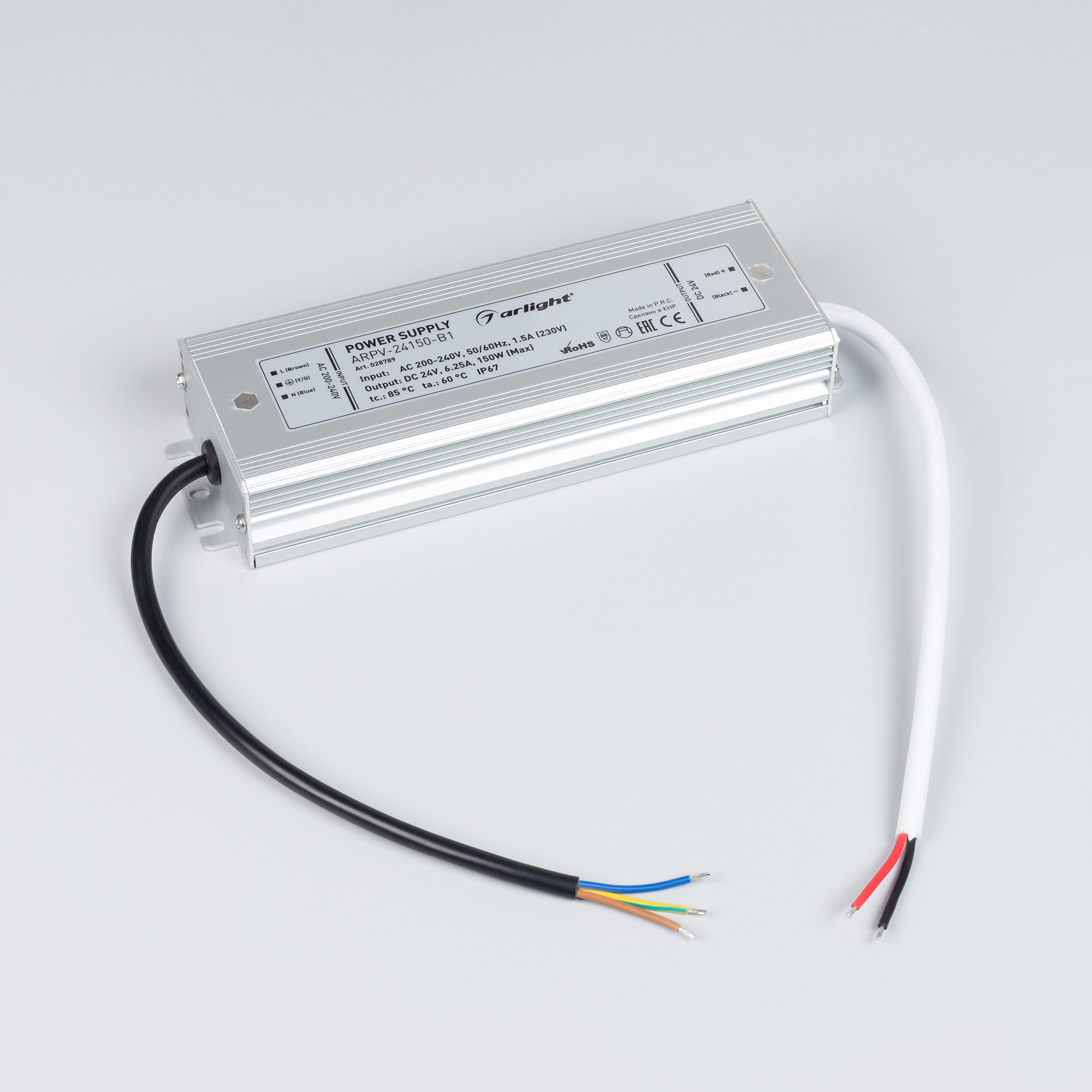 Источник напряжения с гальванической развязкой для светодиодных изделий. Входное напряжение 200-240 VAC. Выходные параметры: 24 В, 6.25 А, 150 Вт. Герметичный алюминиевый корпус IP 67. Рабочая температура -30…+50C⁰. Габаритные размеры длина 202 мм, ширина 67 мм, высота 34 мм. Совместим с диммерами с частотой ШИМ более 5кГц. Гарантийный срок 3 года.