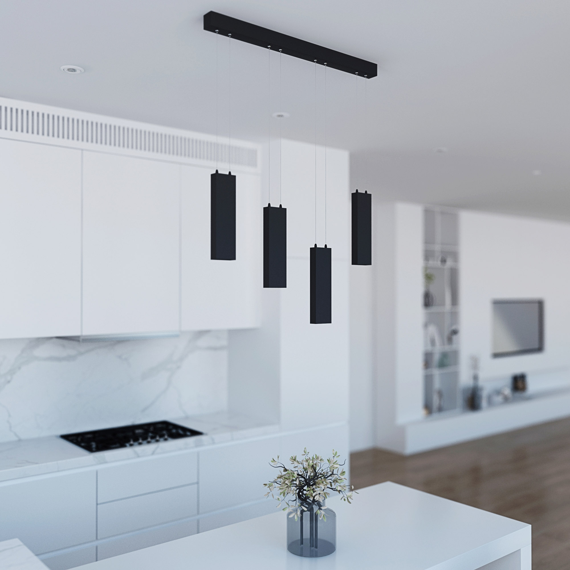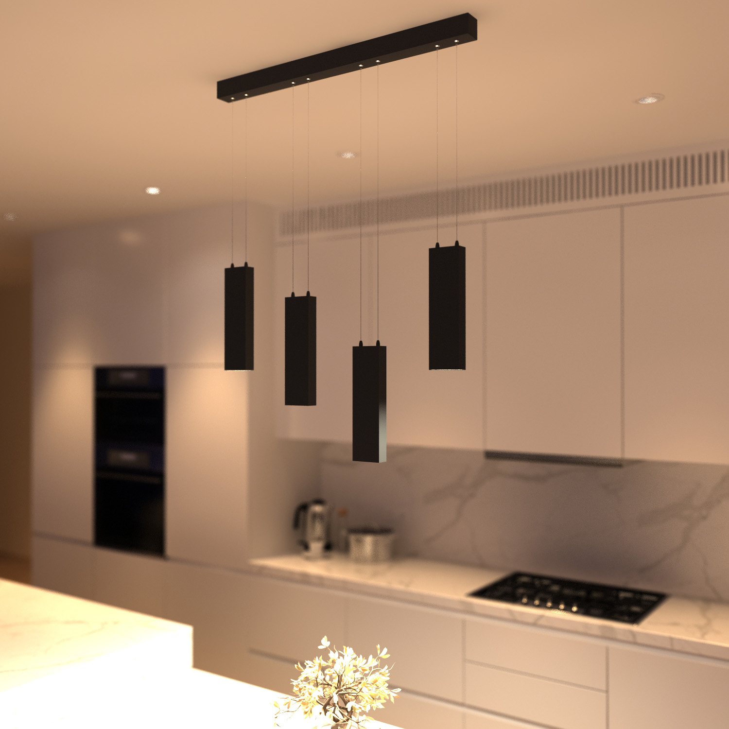 Подвесной светильник 4х6Вт, черный корпус, материал алюминий. Цвет ТЕПЛЫЙ БЕЛЫЙ 3000K, св.поток 2100лм, CRI(Ra)>80, угол 34°. Размер 835x50x1200мм. Питание AC220-240, драйвер в комплекте (30-42V, 600mA), 24Вт. Гарантия 3 года.