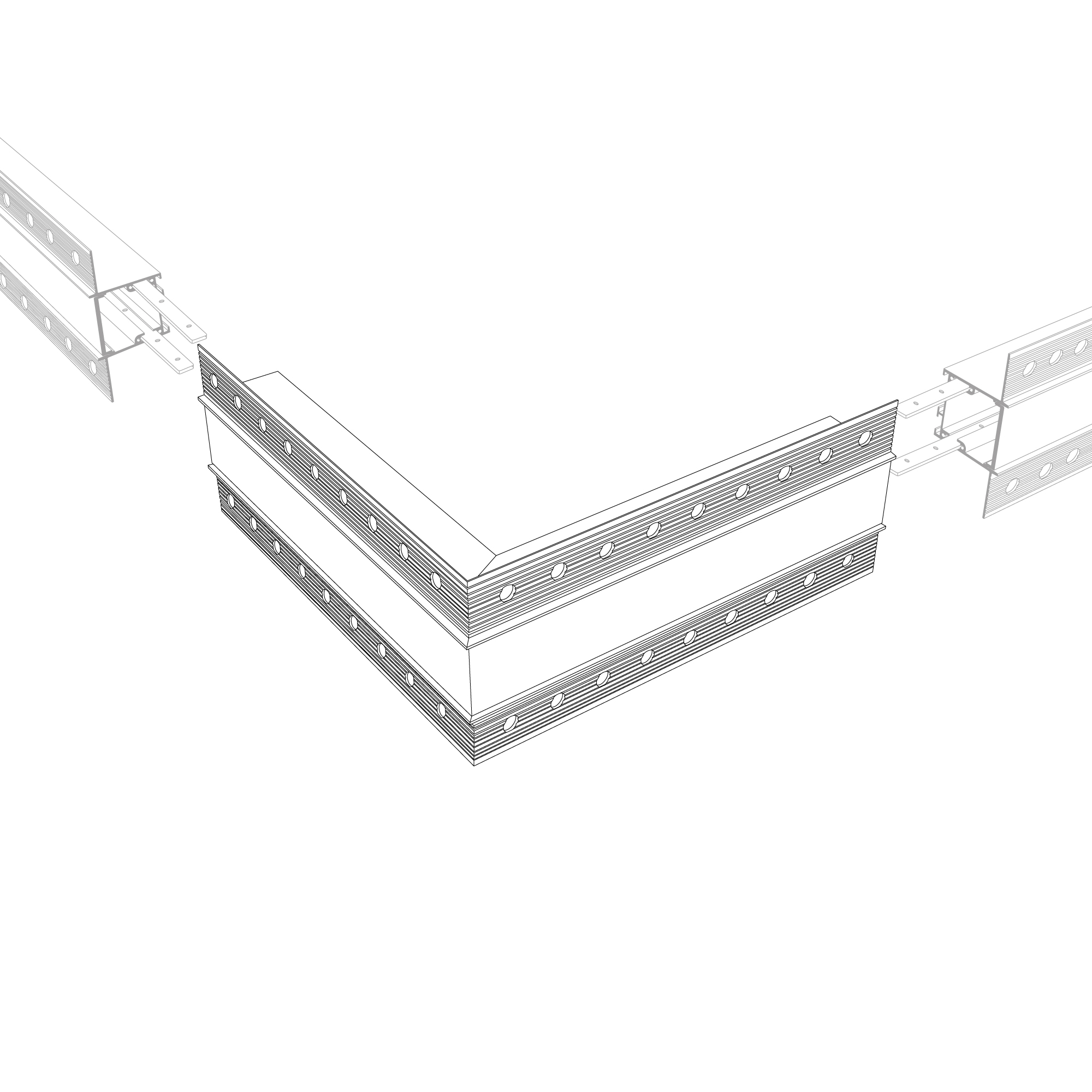 Внешний прямой угол в сборе со скрытым фланцем под строительную отделку для соединения двух профилей SL-LINIA32-FANTOM под прямым углом 90° в разных плоскостях в комплекте с матовым экраном и соединителями. Экран образует линию по внешней стороне угла. Применятся при изготовлении светильников сложной геометрии.