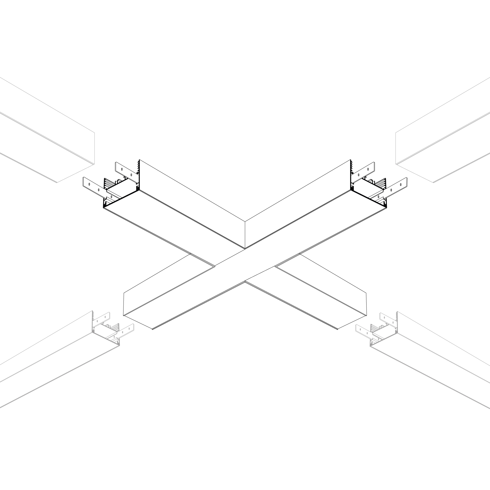 Крестовой угол в сборе для соединения четырех профилей SL-LINE-5035 под прямыми углами 90° в одной плоскости в комплекте с матовым экраном, соединителями и винтами. Экран образует Х-образную фигуру на плоскости. Применятся при изготовлении светильников сложной геометрии. Длина крестовины 400 мм. Цена за комплект.