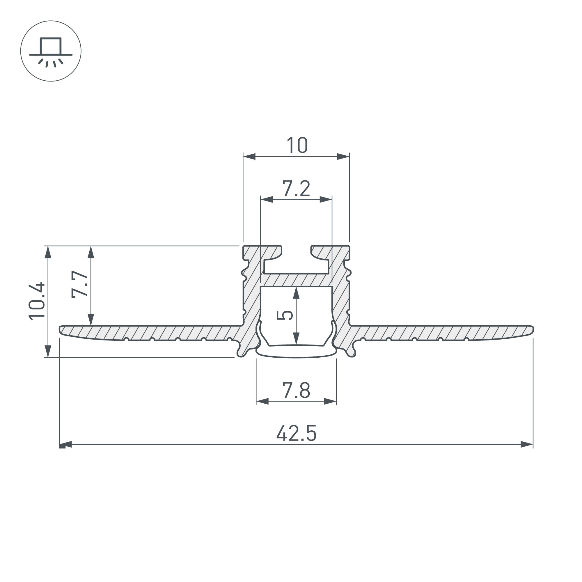 Алюминиевый встраиваемый мини-профиль со скрытым фланцем под строительную отделку для подсветки пазов, ниш и других элементов интерьера. Габаритные размеры профиля составляют 2000 мм в длину, 42,5 мм в ширину и 10,4 мм в высоту. Площадка для установки светодиодных лент позволяет использовать ленту шириной до 7,8 мм и мощностью до 23,46 Вт/м. Это обеспечивает гибкость в выборе светодиодных лент и создает потрясающие световые решения.