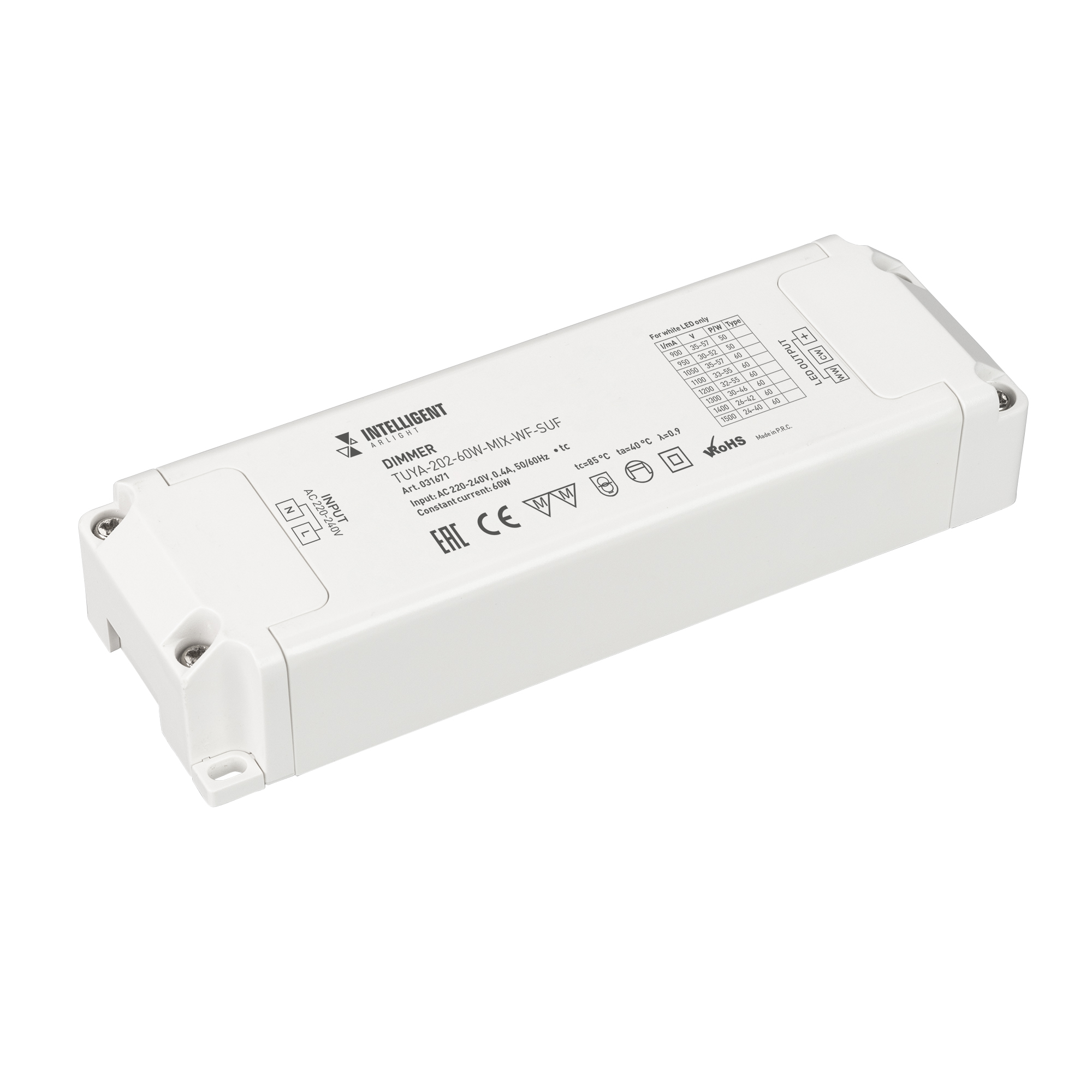 Диммер двухканальный, для светодиодных MIX (CCT, Tunable White) светильников. Выбор значения выходного тока осуществляется подстроечным резистором на плате. Вход 220-240V AC, PF>0.95 выход 900-1500mA@24-50V DC (в зависимости от вых. тока), мощность 60W. Низкий пусковой ток <5А@100mks. Защита от КЗ на выходе, перегрузки, перегрева. Управление через WI-FI 2.4ГГц.Управляется панелями серии TY-228-х-RF, совместим с платформой TUYA, и АЛИСА от ЯНДЕКС. Управление со смартфона через приложение INTELLIGENT ARLIGHT