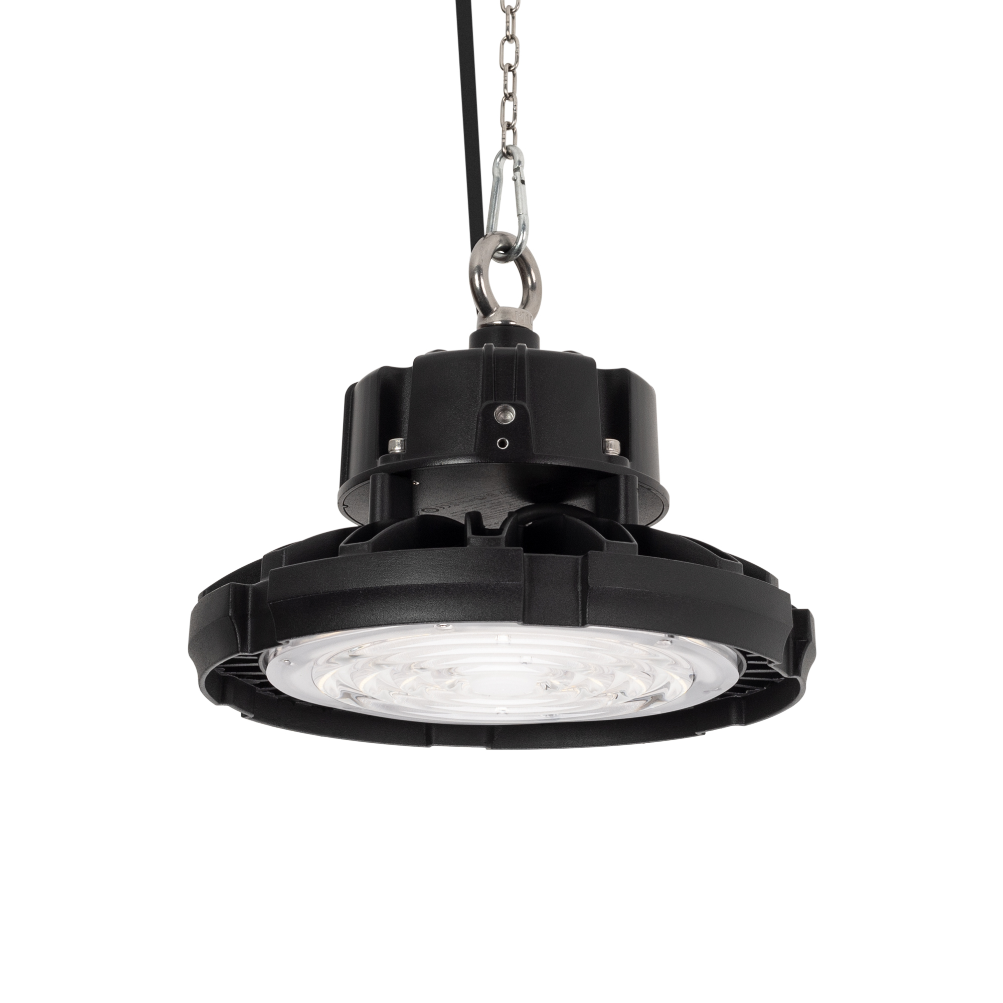 Светильник SP-FENIX-R245-100W White5000 (BK, 120 deg, 230V) мощностью 100 Вт для освещения складских, производственных, промышленных, торговых, спортивных и других помещений с высокими потолками. Дневной белый цвет свечения (5000 K), световой поток 14000 лм и угол излучения 120° для организации общего освещения. Светильник может стать эффективной заменой светильников с лампами МГЛ, ДРЛ, ДНаТ. Высокая степень пылевлагозащиты IP65 допускает использование в помещениях с перепадами температуры и влажности. Светильник имеет два способа крепления: подвесной и установка на фиксирующей скобе. Рым-болт поставляется в комплекте. Под заказ возможна поставка модификаций с управлением по аналоговому протоколу 0–10 В.