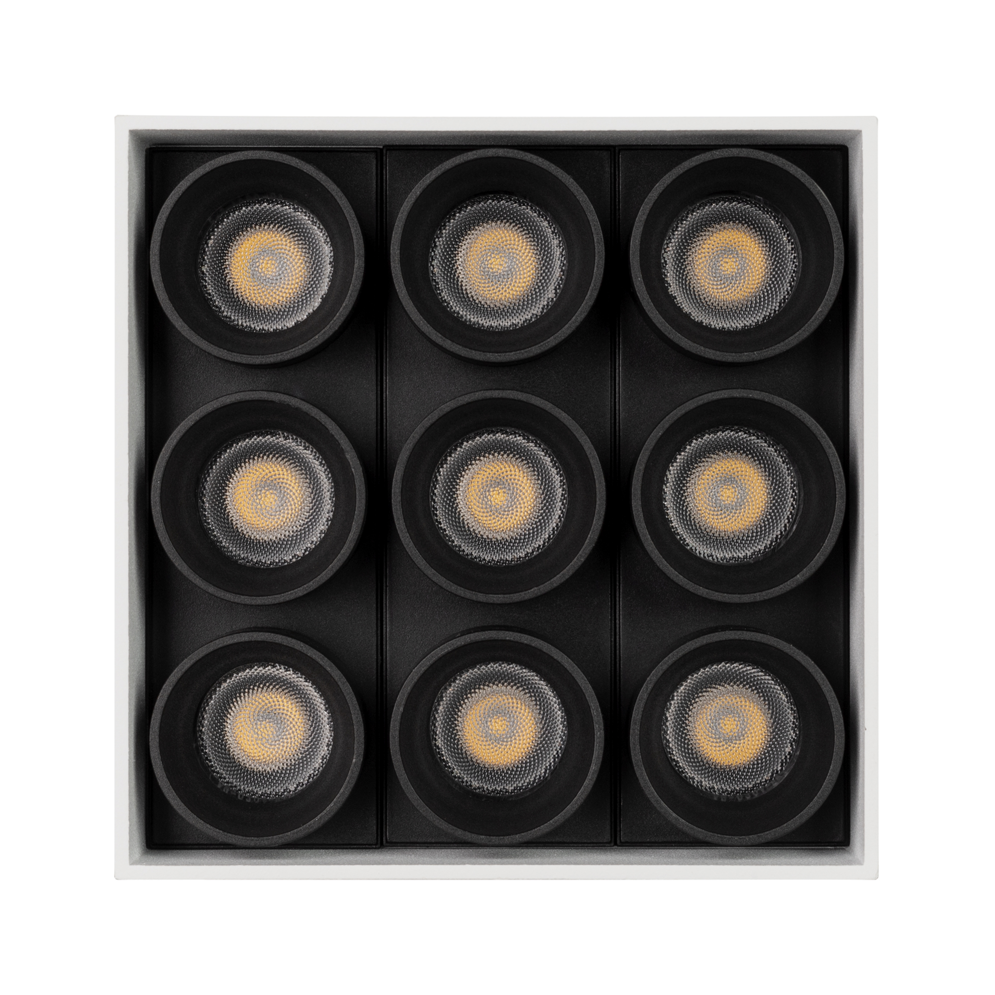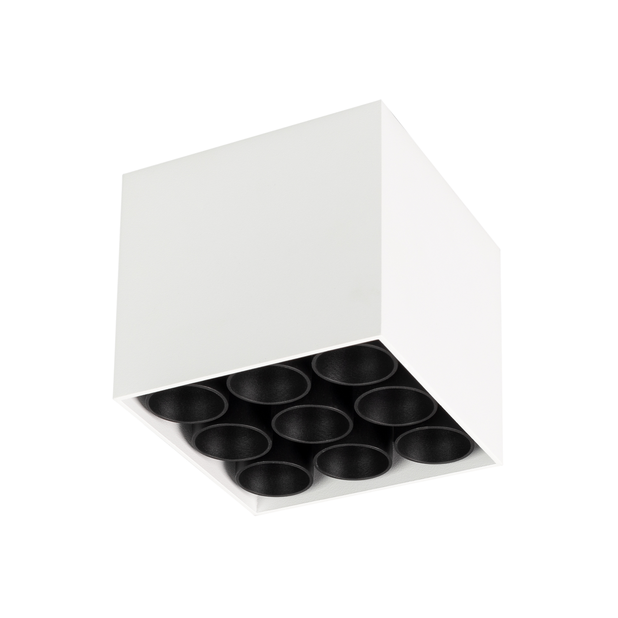 Накладной интерьерный светильник. Мощность 20 Вт, св. поток 1431 лм, 68 лм/Вт, дневной 4000 K, CRI>98, угол 30°, напряжение питания 230 В. Белый квадратный корпус из алюминия, степень защиты IP20. Размер: длина 95 мм, ширина 95 мм, высота 85 мм. Монтаж накладной. Драйвер 21-40 В, 600 мА, пульсация <5%.