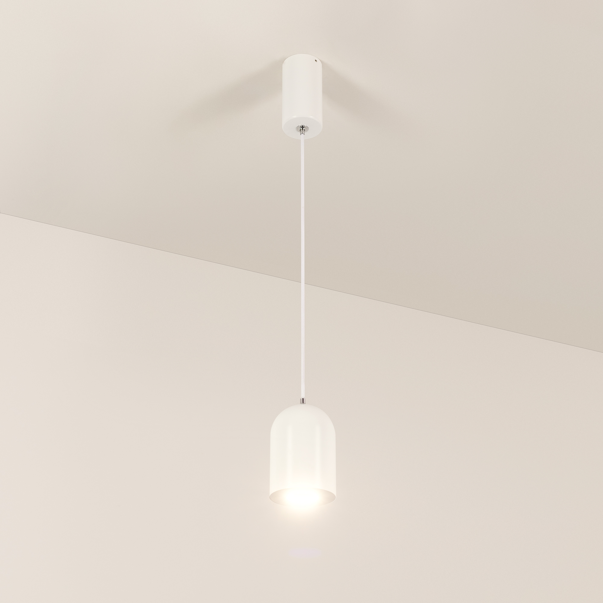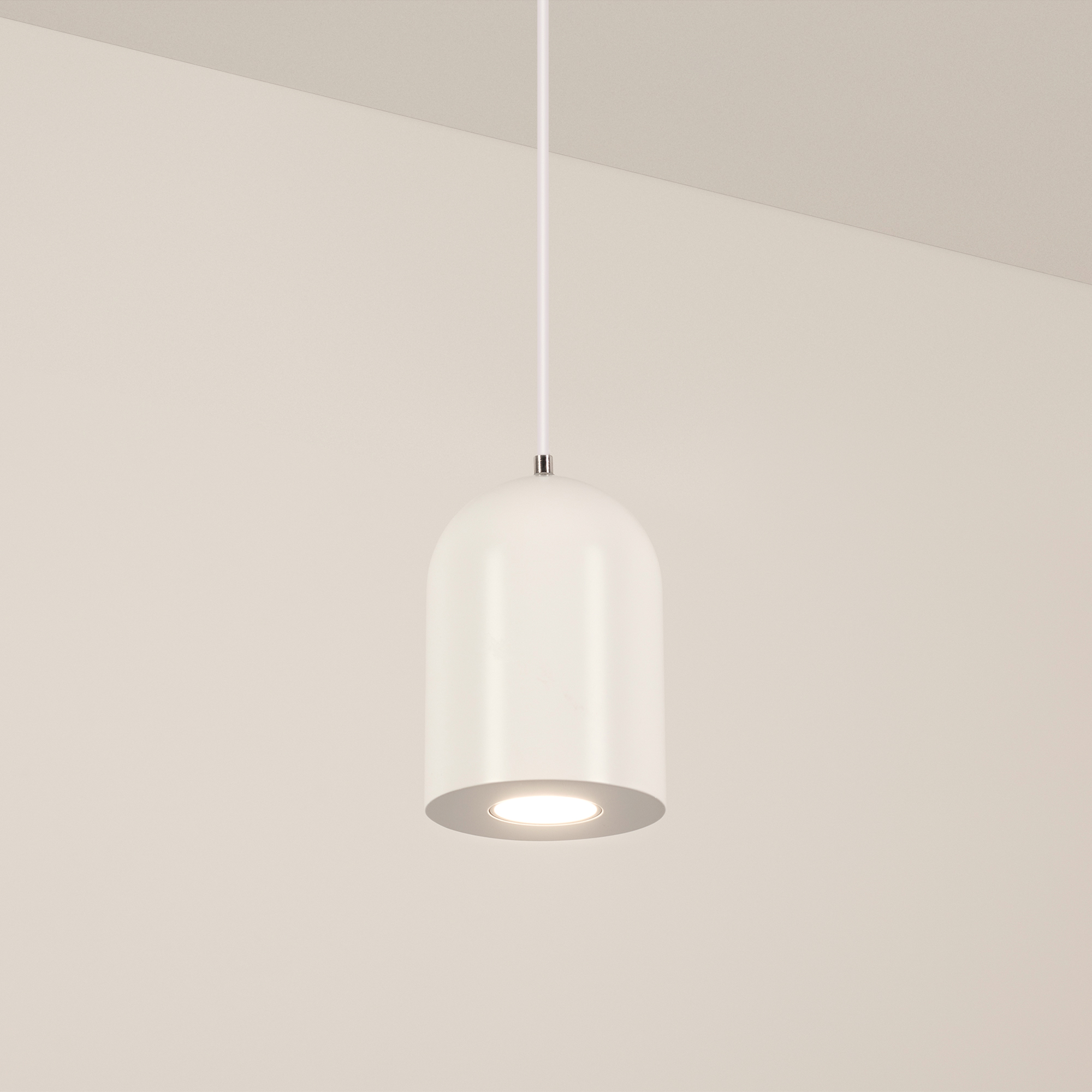 Подвесной светильник. Мощность 9 Вт, св. поток 650 лм, 73 лм/Вт, теплый 3000 K, CRI>80, угол 39°, напряжение питания 230 В. Белый корпус из алюминия, экран , степень защиты IP40. Размер: диаметр 71 мм, высота 100 мм. Монтаж подвесной, длина подвеса 1500мм, регулируемая. Габариты чаши Ø50x95 мм. Драйвер 28-42 В, 250 мА, пульсация <5%.