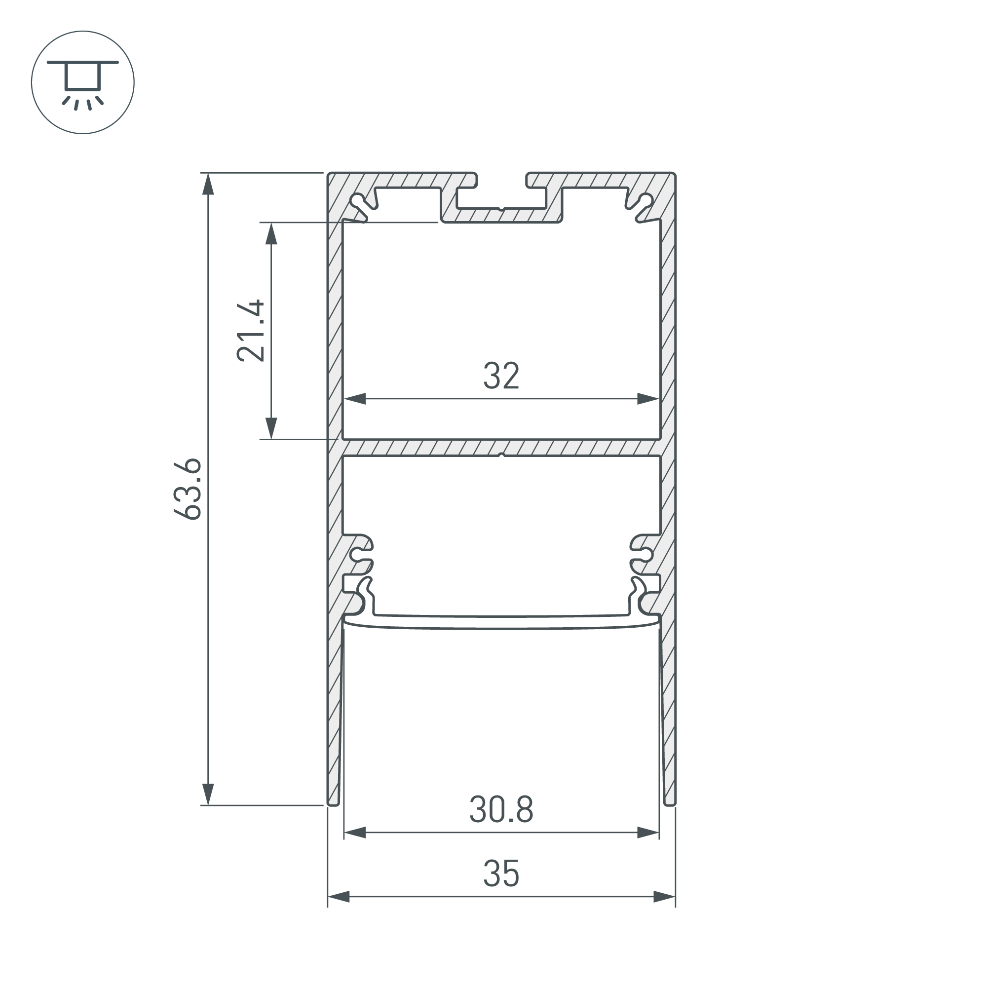 Под заказ от 200 м. Подвесной/накладной профиль из анодированного алюминия для основной и контурной подсветки помещений. Экран утоплен в плоскости профиля, что позволяет скрыть источник света от прямого контакта с глазами. Габаритные размеры профиля составляют 2000 мм в длину, 35 мм в ширину и 64 мм в высоту. Площадка для установки светодиодных лент позволяет использовать ленту шириной до 32 мм и мощностью до 52 Вт/м. Это обеспечивает гибкость в выборе светодиодных лент и создает потрясающие световые решения.