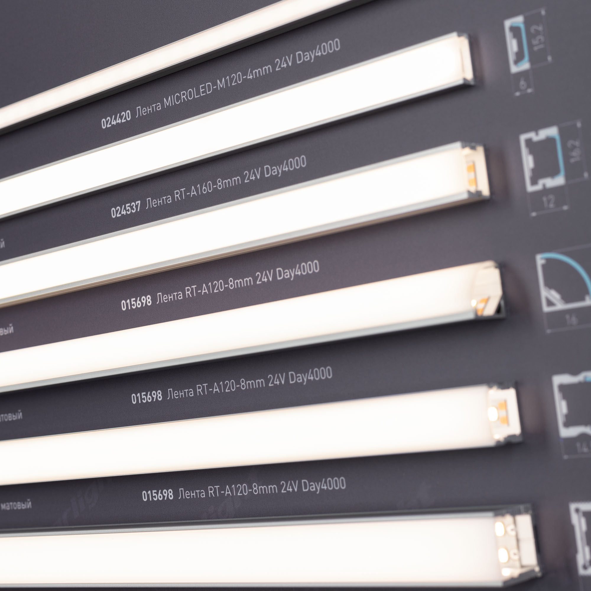 Обзорный мини-стенд по ассортименту светодиодных лент и их применению совместно с накладным профилем для декоративного и основного освещения.