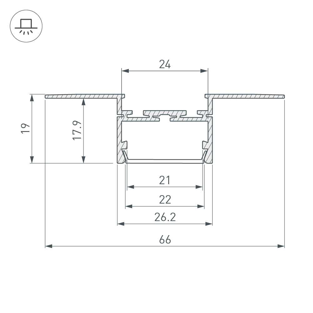 Габаритные размеры профиля составляют 2000 мм в длину, 66 мм в ширину и 19 мм в высоту. Площадка для установки светодиодных лент позволяет использовать ленту шириной до 24 мм и мощностью до 38,6 Вт/м. Это обеспечивает гибкость в выборе светодиодных лент и создает потрясающие световые решения.