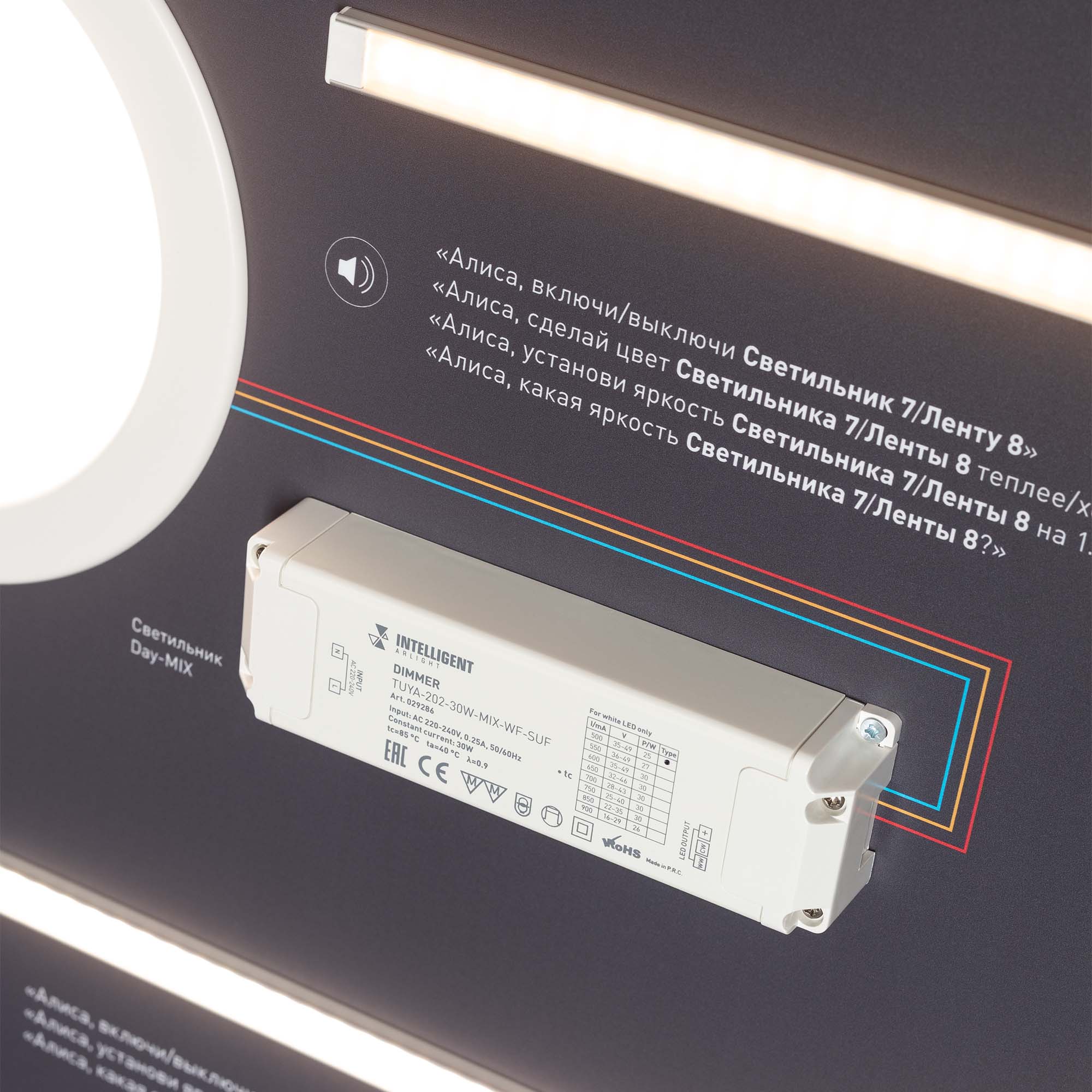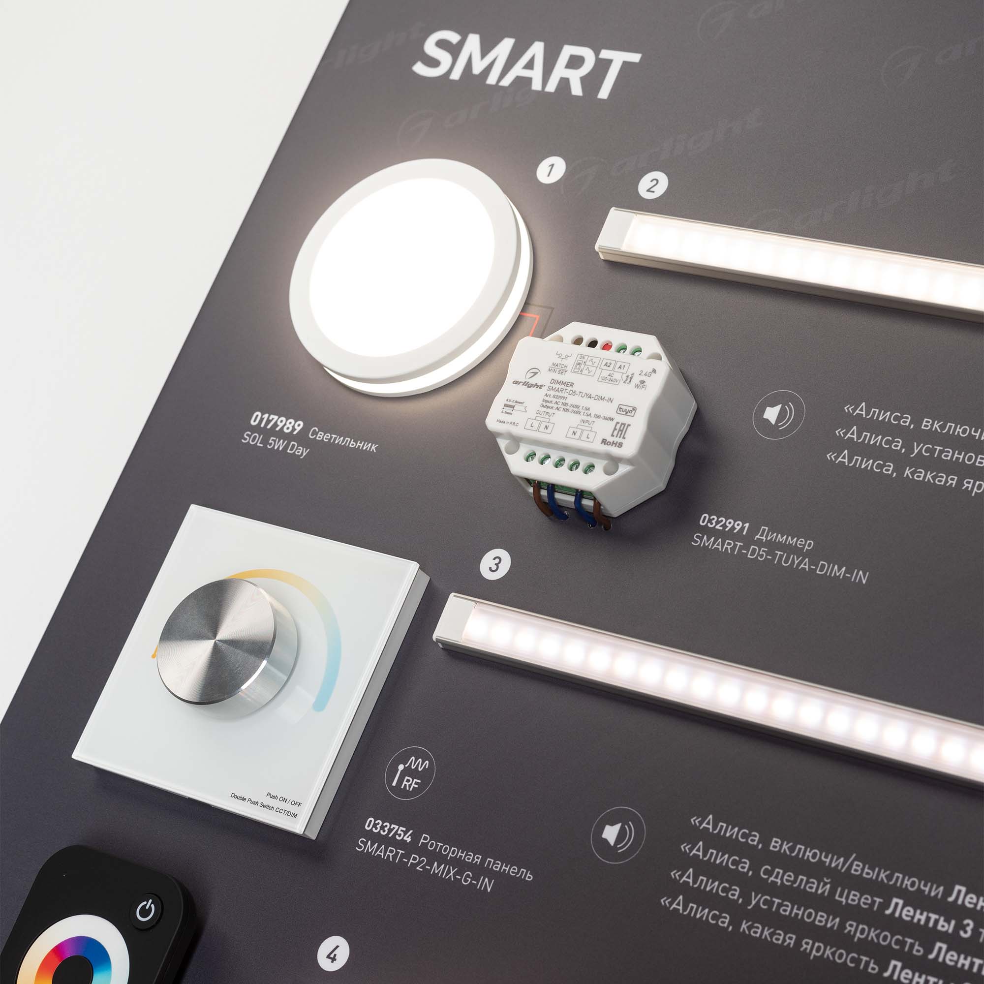 На стенде визуализирован процесс управления освещением с помощью облачных решений TUYA. Реализована возможность голосового управления освещением.