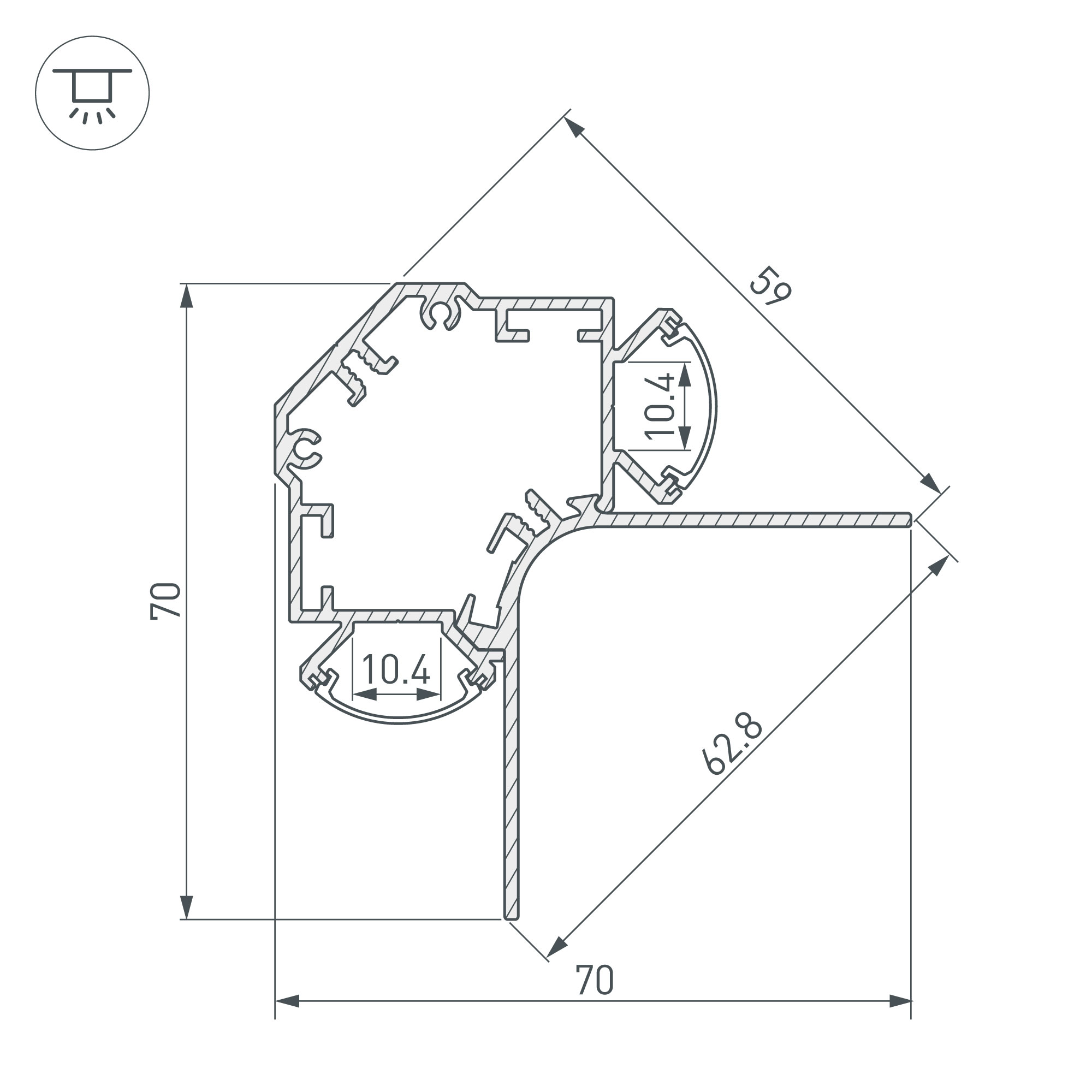 Угловой алюминиевый профиль белого цвета с двусторонним свечением с эффектом «отраженного света» для контурной подсветки интерьера. Скругленный угол профиля позволяет достичь высокой точности установки при любых неровностях. Съемная декоративная лицевая часть облегчает процесс монтажа. Габаритные размеры профиля составляют 2000 мм в длину, 70 мм в ширину и 70 мм в высоту. Площадки для установки светодиодных лент позволяют использовать ленты шириной до 10,4 мм и мощностью до 28 Вт/м каждая. Это обеспечивает гибкость в выборе светодиодных лент и создает потрясающие световые решения.