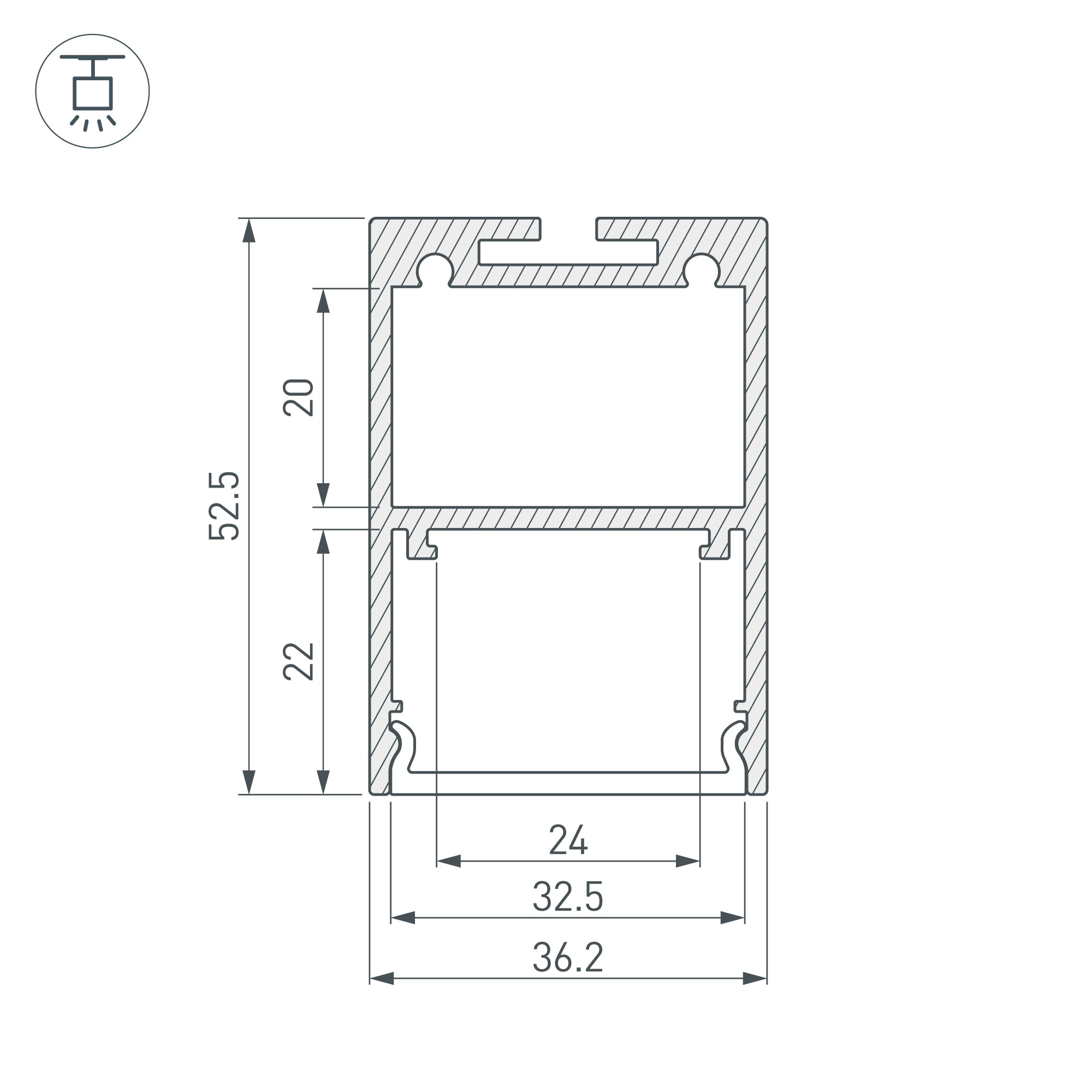 Подвесной профиль из анодированного алюминия с отсеком для блока питания (32х20 мм) для контурной подсветки помещений. Габаритные размеры профиля составляют 3000 мм в длину, 36,2 мм в ширину и 52,5 мм в высоту. Площадка для установки светодиодных лент позволяет использовать ленту шириной до 24 мм и мощностью до 46,5 Вт/м. Это обеспечивает гибкость в выборе светодиодных лент и создает потрясающие световые решения.