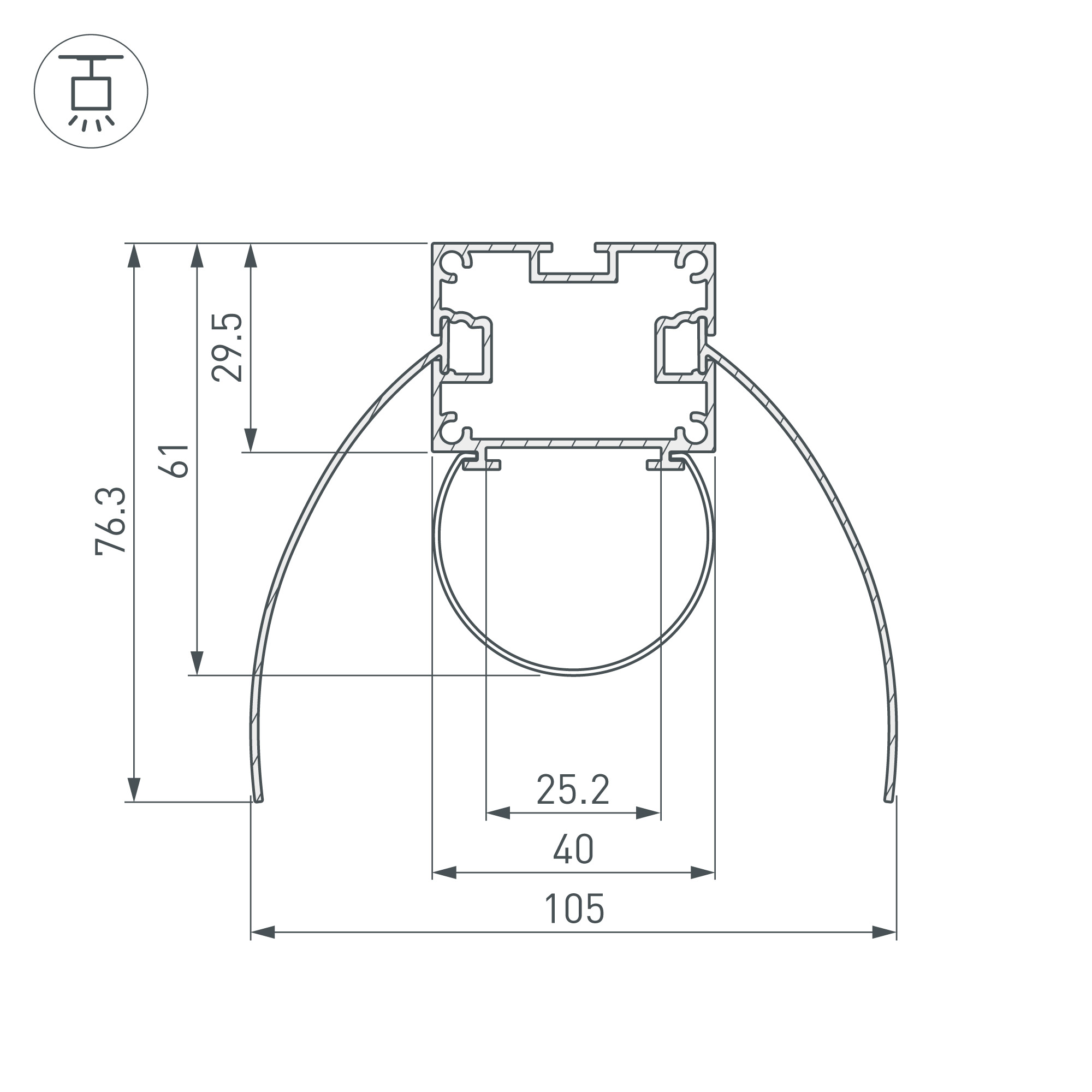 Габаритные размеры профиля составляют 2000 мм в длину, 154 мм в ширину и 61 мм в высоту. Площадка для установки светодиодных лент позволяет использовать ленту шириной до 25,2 мм и мощностью до 42 Вт/м. Это обеспечивает гибкость в выборе светодиодных лент и создает потрясающие световые решения.